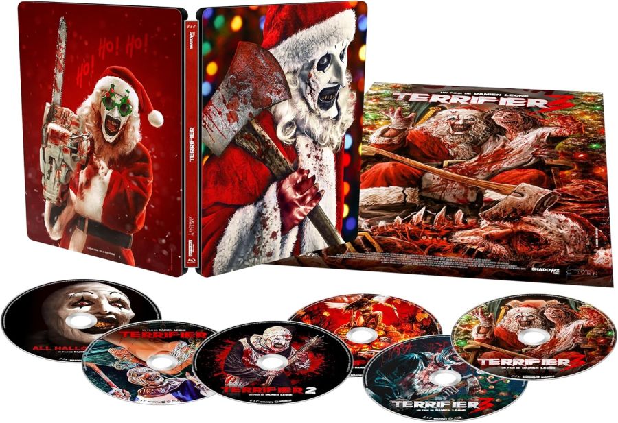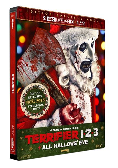 Les fans d’horreur et d’Art le Clown vont être comblés : un nouveau Steelbook 4K Ultra HD + Blu-ray (spécial Noël 2025) regroupant Terrifier (2016), Terrifier 2 (2022), Terrifier 3 (2024) et All Hallow’s Eve (2013) sortira en France juste à temps pour les prochaines fêtes de fin d'année. Prévue pour le 3 décembre 2025, cette édition limitée au boîtier SteelBook s’imposera comme un incontournable pour les amateurs de frissons extrêmes.