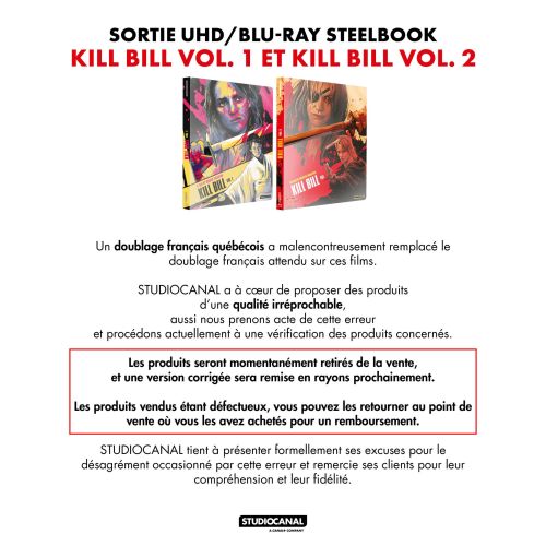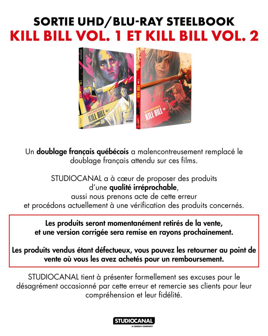 MAJ du 18.11 : L'éditeur Studiocanal a récemment publié un communiqué officiel concernant la sortie en Ultra HD Blu-ray Steelbook de Kill Bill Vol. 1 et Vol. 2. En raison d'une erreur technique lors de la production, la piste sonore française prévue a été remplacée par un doublage québécois (VFQ).
