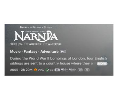 À l’image de Minority Report (2002) avant sa sortie en 4K Ultra HD Blu-ray, Le Monde de Narnia : Chapitre 1 (2005) a récemment bénéficié d’une mise à niveau sur iTunes : désormais disponible en 2160p Dolby Vision, avec sa version originale remixée en Dolby Atmos. Cette évolution coïncide avec la présence d’une version Dolby Vision comparable sur la plateforme premium Kaleidescape aux États-Unis.