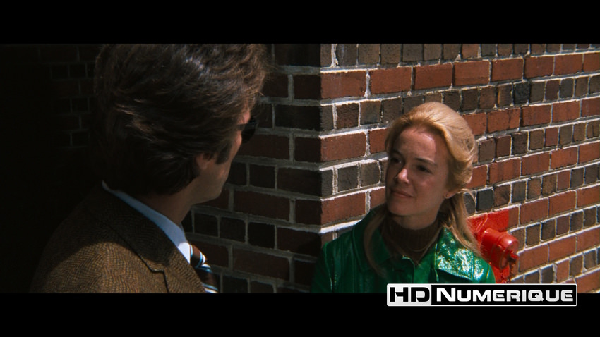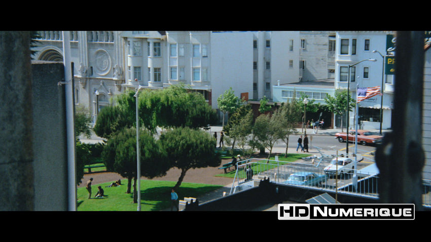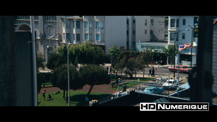 Le premier constat tient à un travail de nettoyage particulièrement poussé, qui tend à uniformiser l’ensemble des séquences, y compris celles recourant aux trucages optiques, historiquement caractérisées par un grain plus hasardeux. Ces passages apparaissent désormais plus propres et s’intègrent de manière plus homogène au reste du long métrage. Le gain en définition est, de son côté, indéniable, même si l’on pouvait légitimement s’attendre à des écarts plus marqués avec le précédent Blu-ray au regard du scan 8K réalisé. Les éléments architecturaux et les textures urbaines de San Francisco profitent néanmoins d’un supplément de précision appréciable : surfaces chromées des véhicules, façades, pavés, mais aussi, en intérieur, bureaux et éléments de mobilier, qui affichent un rendu un peu plus fin et ciselé.