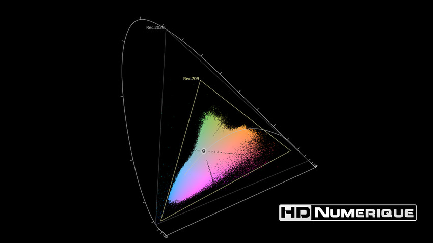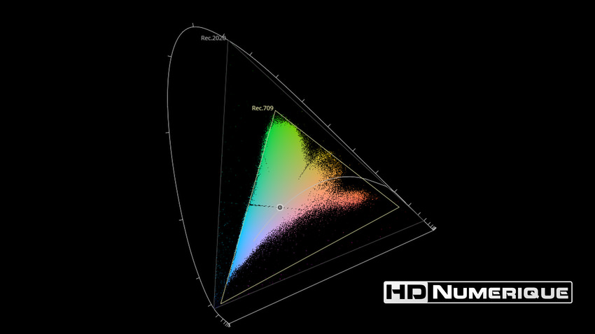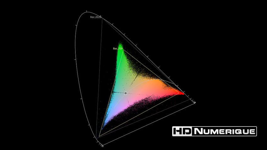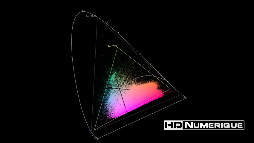 Afin de mettre en évidence l'utilisation concrète du Wide Color Gamut (WCG) sur cette édition (voir tutoriel ici), les pixels qui se situent dans la gamme standard/BT.709 (confinés à l'intérieur du petit triangle REC.709) vous sont présentés ici entièrement désaturés. A l'inverse, ceux faisant partie de la gamme élargie BT.2020, exclusive au disque 4K Ultra HD Blu-ray (qui s'étendent à l'extérieur du petit triangle REC.709) vous sont présentés en couleur :