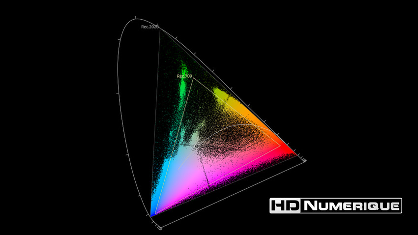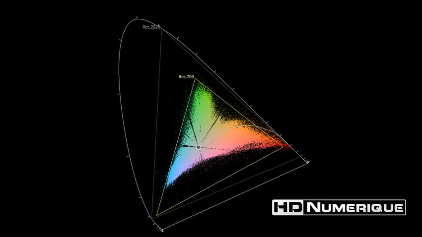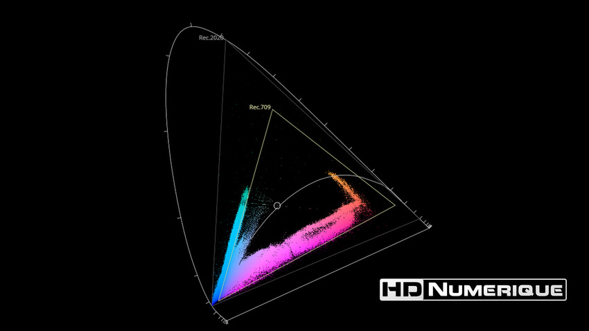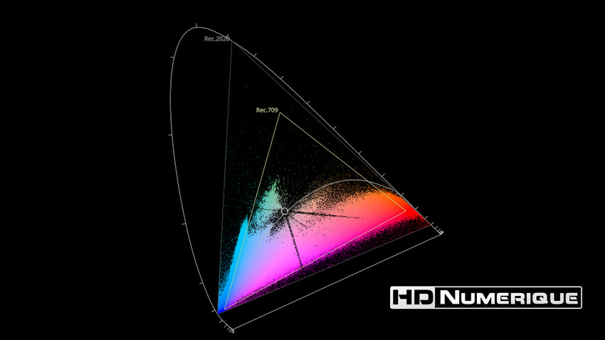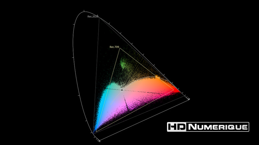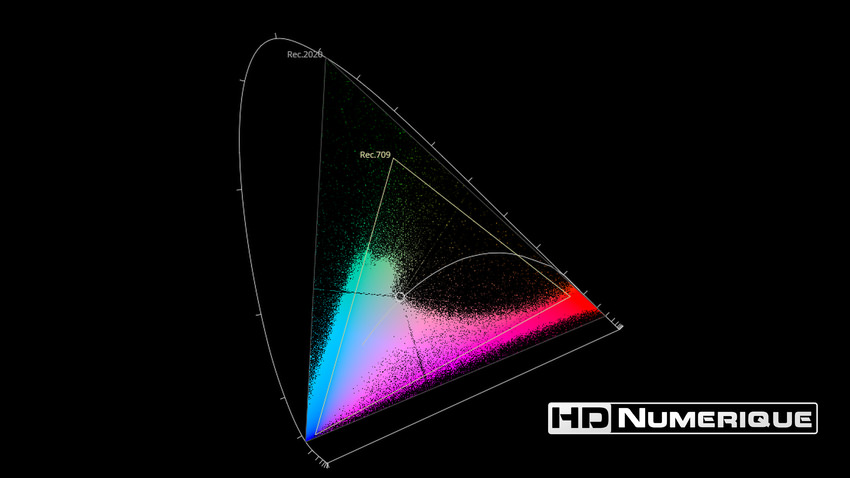 Afin de mettre en évidence l'utilisation concrète du Wide Color Gamut (WCG) sur cette édition (voir tutoriel ici), les pixels qui se situent dans la gamme standard/BT.709 (confinés à l'intérieur du petit triangle REC.709) vous sont présentés ici entièrement désaturés. A l'inverse, ceux faisant partie de la gamme élargie BT.2020, exclusive au disque 4K Ultra HD Blu-ray (qui s'étendent à l'extérieur du petit triangle REC.709) vous sont présentés en couleur :