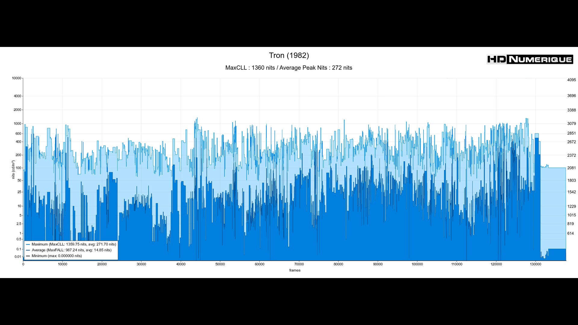 L'étalonnage HDR se distingue nettement. Il apporte des améliorations fortes. Il s’approprie l’univers de Tron et son aura lumineuse avec audace. D’abord par la mobilisation généreuse d’une palette de couleurs WCG. Dans les contraintes du P3, elle transcende les propositions de l’époque : les bleus, les rouges et les jaunes s’en donnent à coeur joie. Ensuite, grâce à l'utilisation d'une plage dynamique bien plus étendue. Elle met en valeur les contrastes distinctifs de Tron (1982), avec des pics de luminosité réguliers et supérieurs à 500 nits. Les costumes vibrent de pulsations électriques. Les halos phosphorescents se détachent. Les disques projettent leurs éclats, les Lumicycles leurs reflets. C’est bien en HDR que Tron (1982) révèle sa pleine dimension lumineuse.