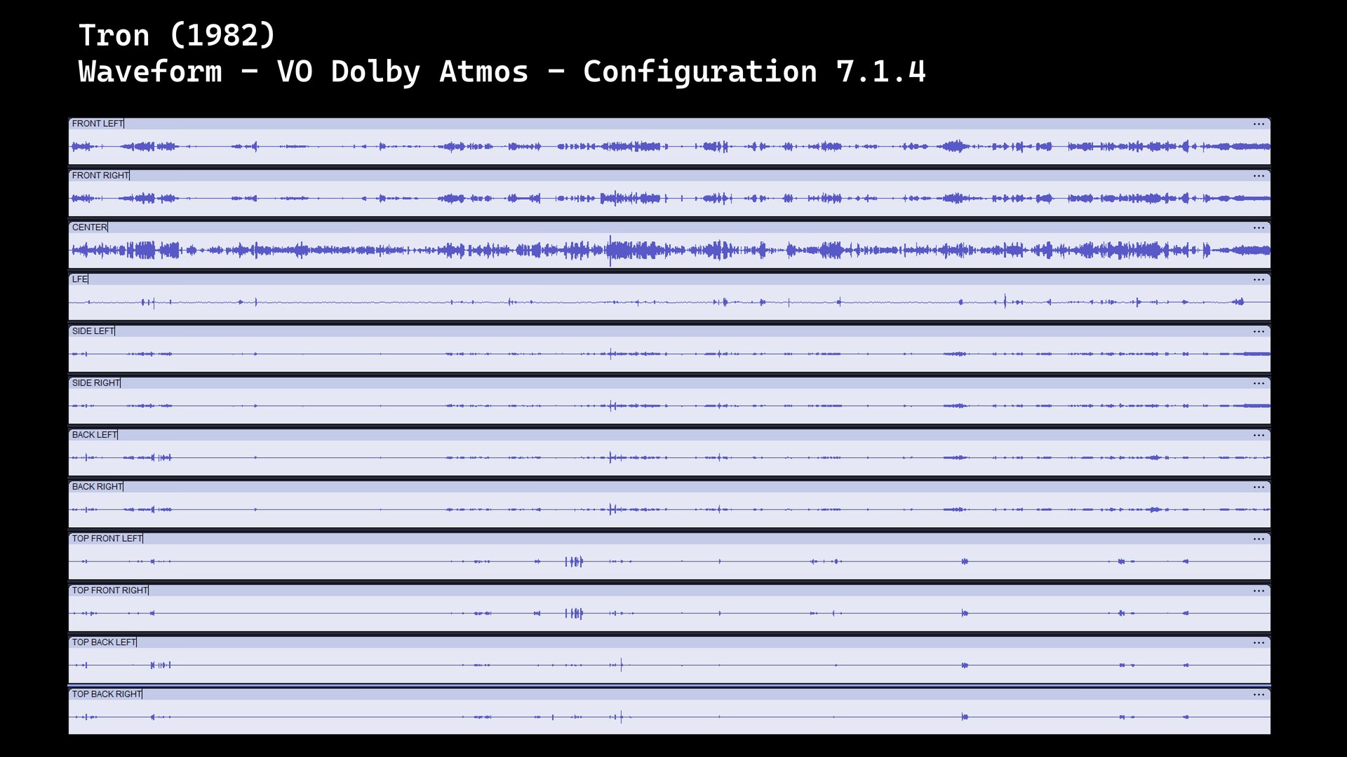 Tron (1982) bénéficie d’une remise à niveau avec cette nouvelle piste en version originale Dolby Atmos. Dès les premières secondes avec l’apparition du logo Tron, une activité aérienne flottante se déploie : subtile au départ, mais déjà révélatrice d’une utilisation perceptible des canaux de hauteur. Dans Tron (1982), ils ne sont pas constamment mobilisés. Mais ils viennent ici et là renforcer l’impression d’être plongé dans un cadre de réalité virtuelle qui perturbe et cloisonne les sens. Un autre exemple marquant : les interventions de la voix autoritaire du Maître Contrôle. Elle émane directement du plafond, conférant au personnage une présence autoritaire et invasive. La séquence emblématique des Lumicycles gagne aussi en ouverture, avec des effets panoramiques réussis. Les basses demeurent légères mais maîtrisées, les dialogues parfaitement intelligibles. Quelques extraits Atmos vous sont présentés en reproduction binaurale dans notre vidéo jointe.
