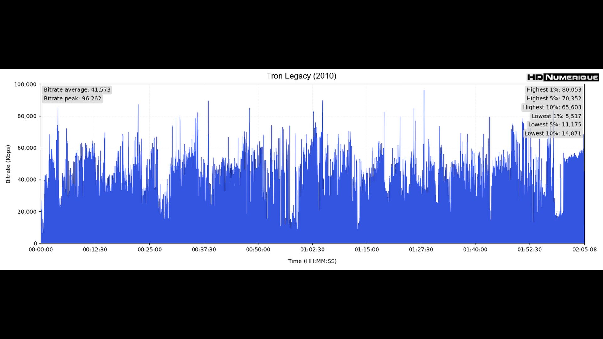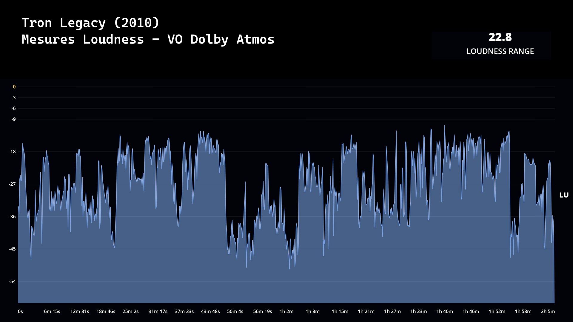 La version originale de Tron : L’Héritage (2010) est restituée en Dolby Atmos (core TrueHD 7.1, 4730 kbps) avec une valeur de Loudness Range mesurée à un solide 22.8 LU. La VF conserve son format DTS-HD High-Res Audio 7.1 (2046 kbps).