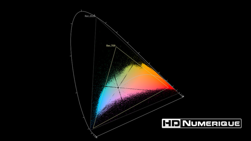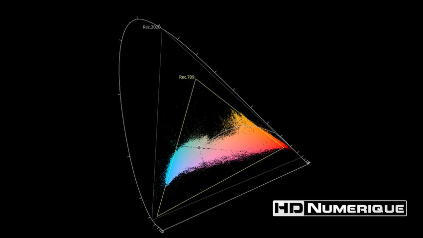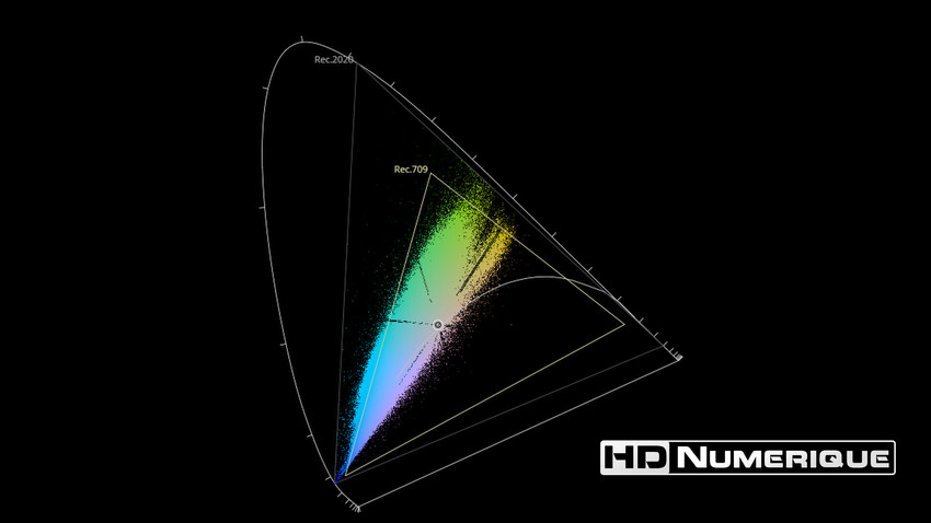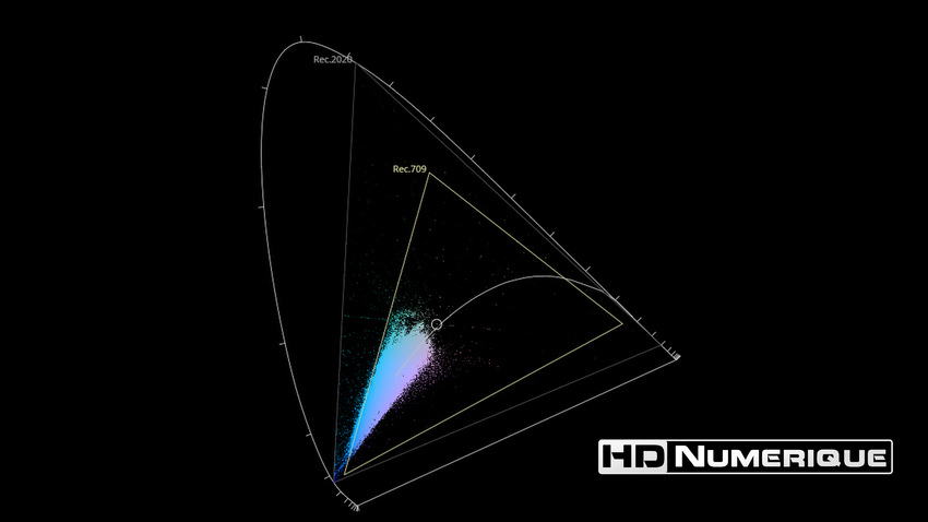 Afin de mettre en évidence l'utilisation concrète du Wide Color Gamut (WCG) sur cette édition (voir tutoriel ici), les pixels qui se situent dans la gamme standard/BT.709 (confinés à l'intérieur du petit triangle REC.709) vous sont présentés ici entièrement désaturés. A l'inverse, ceux faisant partie de la gamme élargie BT.2020, exclusive au disque 4K Ultra HD Blu-ray (qui s'étendent à l'extérieur du petit triangle REC.709) vous sont présentés en couleur :
