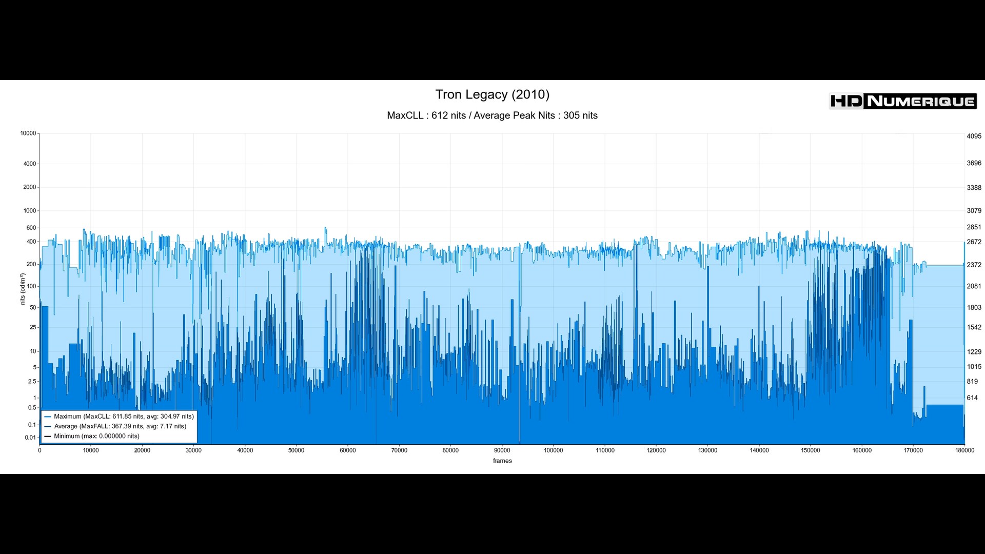 Soyons clairs : cette version UHD se distinguera surtout par son nouvel étalonnage HDR, une observation logique pour un film où la lumière est "objet". Circuits, liserés de combinaisons, anneaux de néons, traînées de Lumicycles et autres arêtes architecturales s’apparentent à des sources lumineuses directes qui donnent corps à l’univers virtuel. Dans un tel contexte, les différences avec la version SDR restent de grande ampleur. Tout cela, sans forcément pulvériser les valeurs de nits, avec un maxCLL modéré et une moyenne de pics lumineux mesurée à 304 nits. L’apport du Wide Color Gamut s’observe surtout dans la dialectique des couleurs qui oppose les factions. Le teal-cyan des héros face aux néons des antagonistes qui explorent des nuances d'orange et de rouge plus menaçantes.