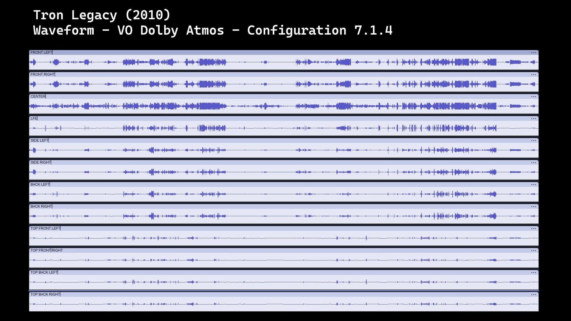 Tron : L’Héritage (2010) bénéficie d’un remixage Dolby Atmos issu de sa matrice originale 7.1. Dans cette version Atmos domestique, le format se traduit par un mixage rehaussé en 7.1.2 canaux, sans présence d’objets ni de clusters d’objets en mouvement observables en Atmos Viewer (voir nos extraits vidéo à l’appui). Cette précision technique posée, le résultat reste pleinement convaincant, tant sur les valeurs de dynamique, de spatialisation que du registre grave.
