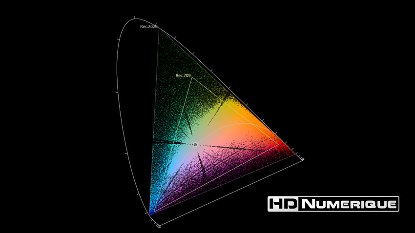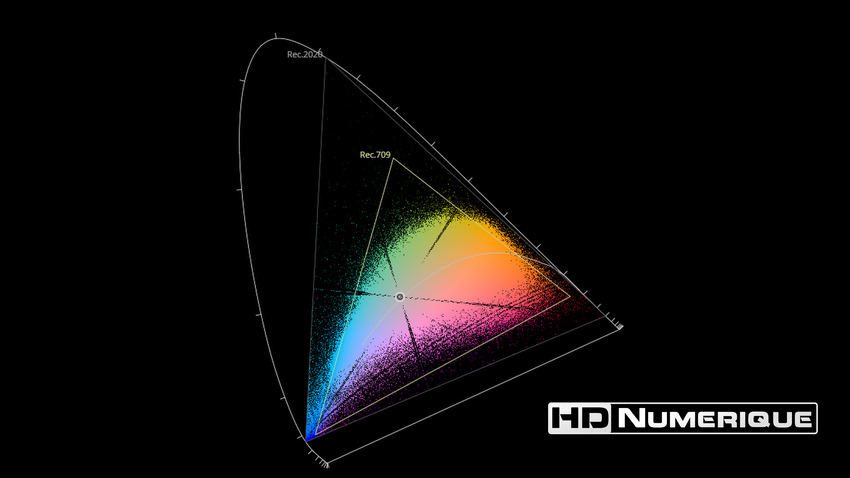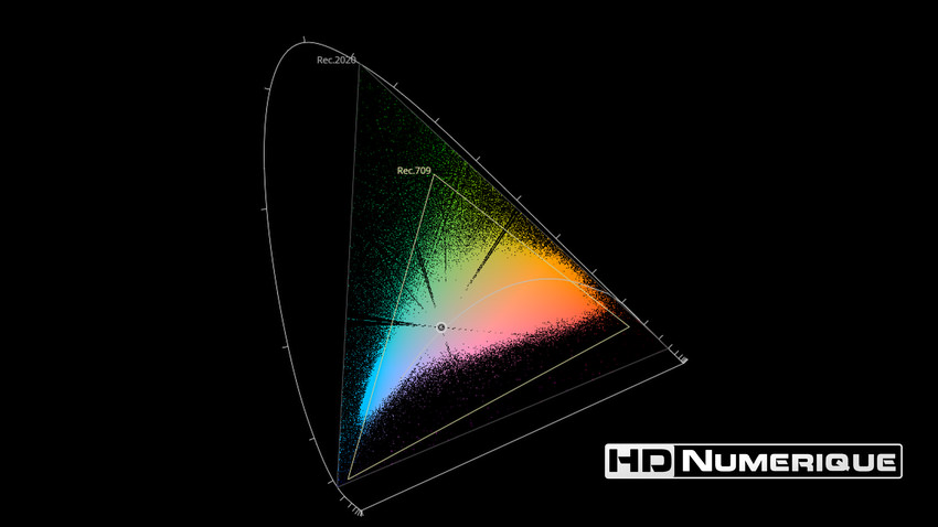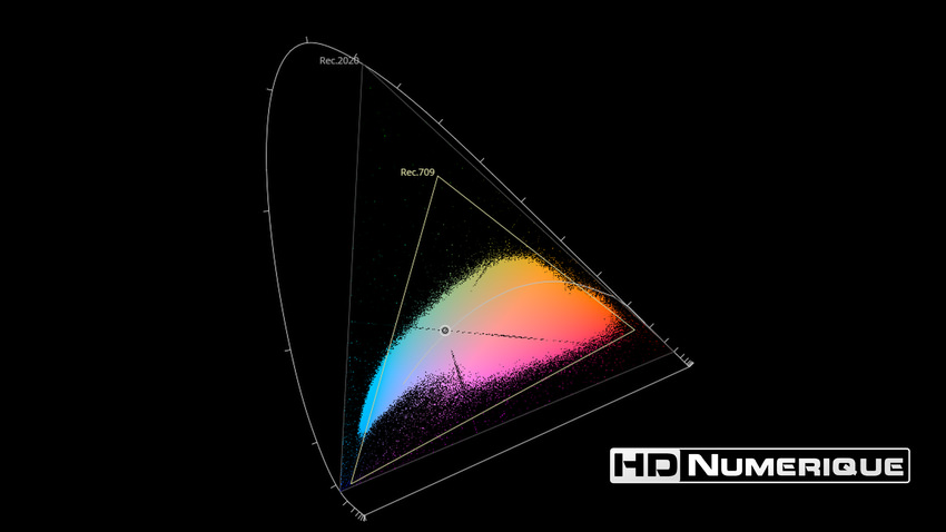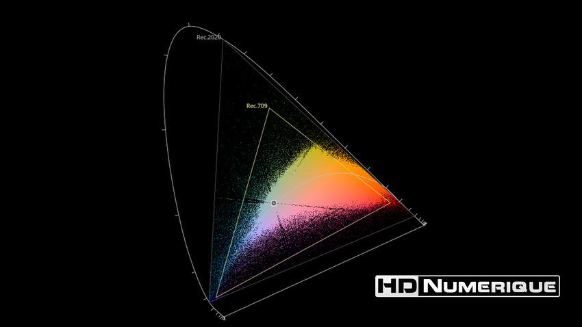 Afin de mettre en évidence l'utilisation concrète du Wide Color Gamut (WCG) sur cette édition (voir tutoriel ici), les pixels qui se situent dans la gamme standard/BT.709 (confinés à l'intérieur du petit triangle REC.709) vous sont présentés ici entièrement désaturés. A l'inverse, ceux faisant partie de la gamme élargie BT.2020, exclusive au disque 4K Ultra HD Blu-ray (qui s'étendent à l'extérieur du petit triangle REC.709) vous sont présentés en couleur :