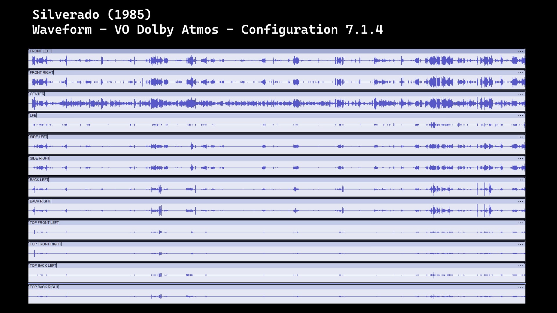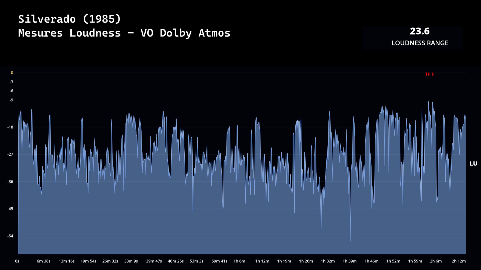 En Atmos, il est désormais possible de localiser avec précision de nombreux effets typiques d’un grand western. Pensez aux coups de feu lors des fusillades, désormais calés sur la position exacte de chaque protagoniste. En conséquence, les ricochets et les balles qui sifflent (les effets directionnels) ont été soigneusement replacés dans l'espace et avec des trajectoires davantage mouvantes. Observés en Atmos Viewer, ce sont de véritables objets en mouvement, avec une mobilisation franche des canaux de hauteur, selon que le plomb arrive d'en haut ou file à travers le canyon. Quelques exemples vous sont présentés dans notre vidéo jointe, en reproduction binaurale.