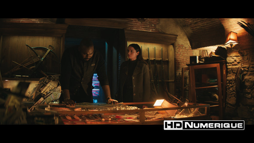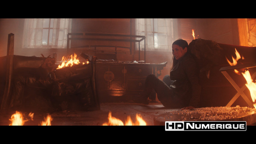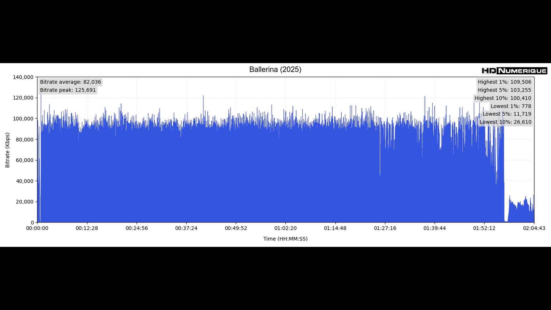 Visuellement, Ballerina (2025) se distingue du rendu certainement plus clinique et numérique de John Wick: Chapitre 4. L’image adopte ici des textures plus marquées, rappelant d’une certaine façon le grain argentique du 35 mm et conférant une signature plus organique, presque éprouvée — un choix artistique qui, à nos yeux, résonne avec l’enfance meurtrie de la protagoniste, Eve. Ces textures respirent d'ailleurs avec une plus grande liberté sur la version UHD, qui s’appuie sur une excellente compression vidéo supervisée par Metropolitan et un bitrate moyen très confortable de 82 Mbps.