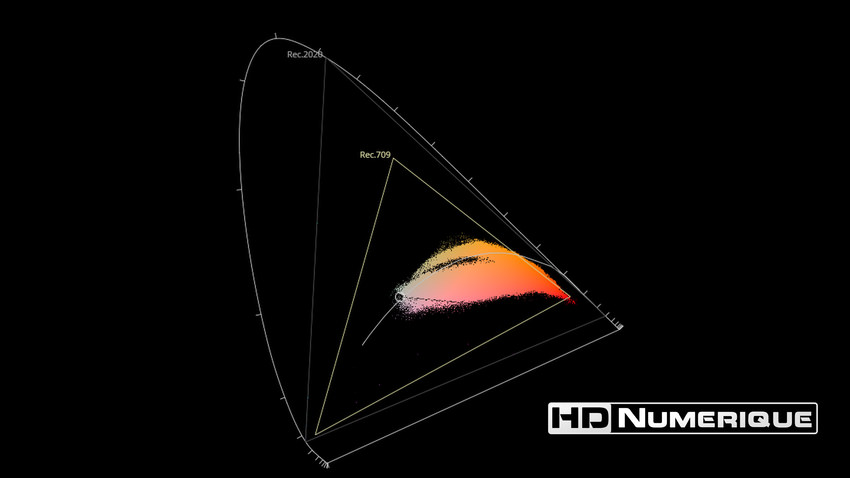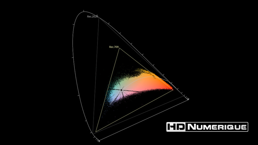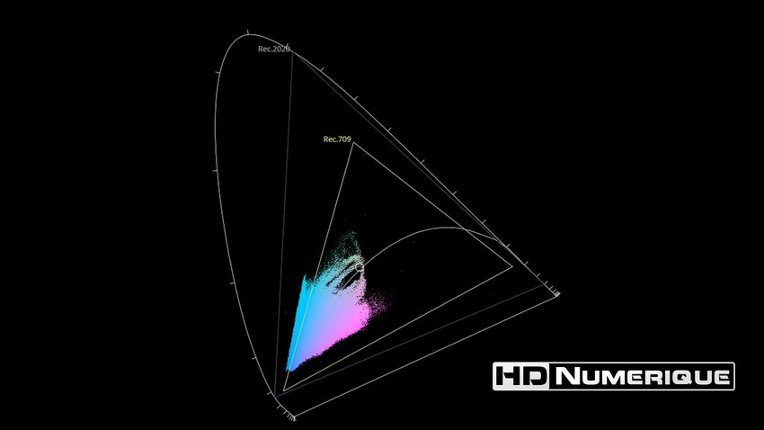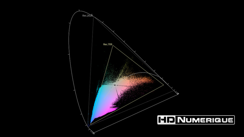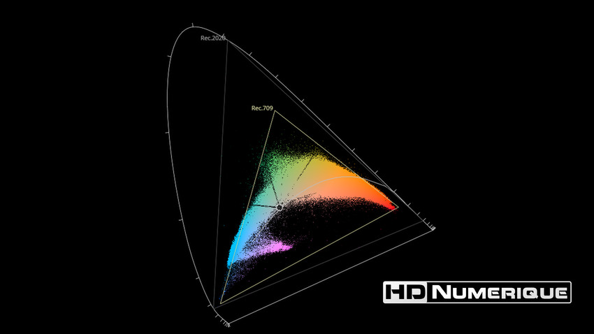 Afin de mettre en évidence l'utilisation concrète du Wide Color Gamut (WCG) sur cette édition (voir tutoriel ici), les pixels qui se situent dans la gamme standard/BT.709 (confinés à l'intérieur du petit triangle REC.709) vous sont présentés ici entièrement désaturés. A l'inverse, ceux faisant partie de la gamme élargie BT.2020, exclusive au disque 4K Ultra HD Blu-ray (qui s'étendent à l'extérieur du petit triangle REC.709) vous sont présentés en couleur :