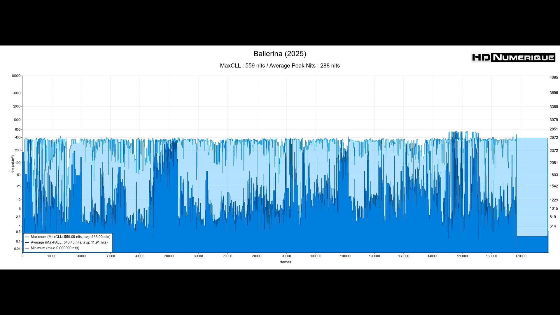 En HDR, le rendu se montre peut-être moins démonstratif que sur le chapitre 4 (2023). Les hautes lumières demeurent généralement plus douces, souvent contenues sous les 400 nits, mais l’apport de la plage dynamique étendue reste notable. Les séquences mémorables de combat au lance-flammes, par exemple, gagnent en impact, avec des pics lumineux nettement supérieurs à la moyenne du long-métrage et très au-dessus de la version SDR. Ballerina (2025) conserve surtout une même grammaire de fond que celle des volets John Wick, fondée sur des contrastes de couleurs vives et où l’apport du Wide Color Gamut s’exprime à son avantage. Visuellement, les kimonos bleu et rouge qui dynamisent les entraînements, le village médiéval enneigé sublimé par des îlots de lumière chaude, et la superbe opposition rose/bleu qui électrise la séquence de l’Ice Club ont retenu notre attention.