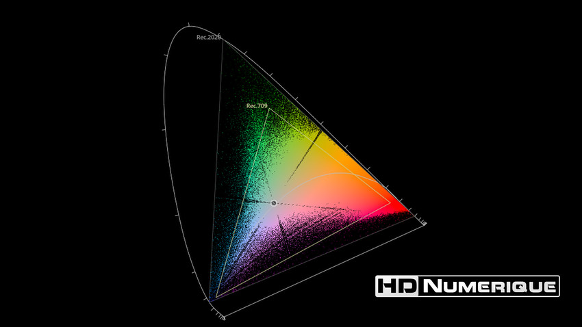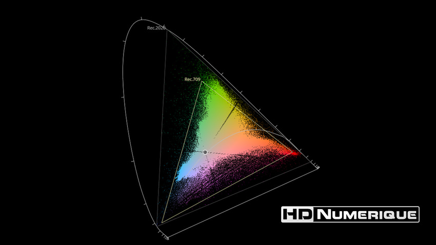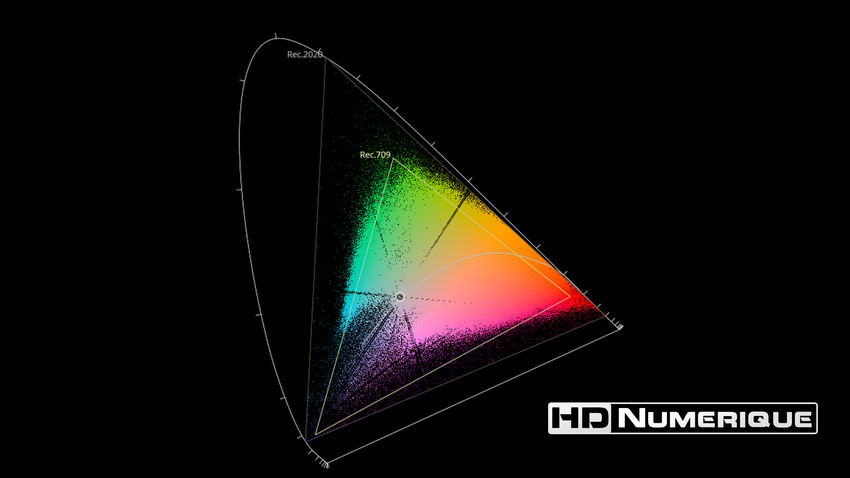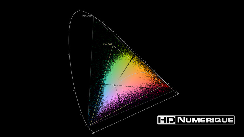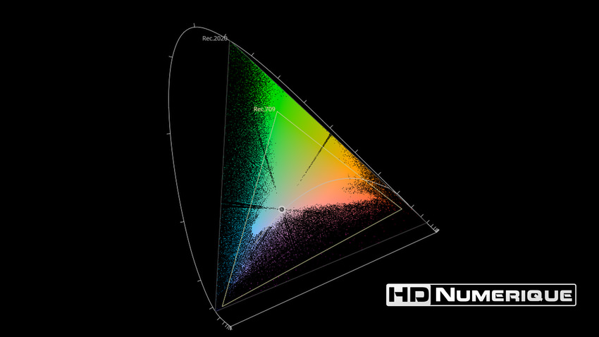 Afin de mettre en évidence l'utilisation concrète du Wide Color Gamut (WCG) sur cette édition (voir tutoriel ici), les pixels qui se situent dans la gamme standard/BT.709 (confinés à l'intérieur du petit triangle REC.709) vous sont présentés ici entièrement désaturés. A l'inverse, ceux faisant partie de la gamme élargie BT.2020, exclusive au disque 4K Ultra HD Blu-ray (qui s'étendent à l'extérieur du petit triangle REC.709) vous sont présentés en couleur :