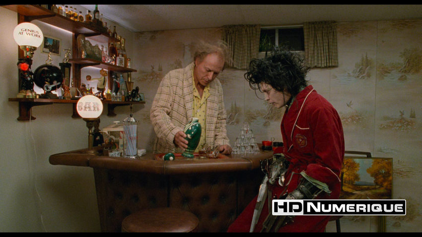 Les images restent propres, sans poussière ostensible et avec un défilement stable. Le gain en définition est réel mais timide : davantage du registre du raffinement que de la révélation. Sur les plans larges de la banlieue de Peg Boggs, l’acuité progresse : façades pastel, pelouses minutieusement taillées, détails architecturaux… tout gagne en lisibilité, mais subtilement. En revanche, sur les gros plans iconiques du visage d’Edward, le passage en UHD expose sans détour les artifices du maquillage de Stan Winston. Sublime, certes, mais désormais sans illusion : latex, raccords et cicatrices se devinent clairement.