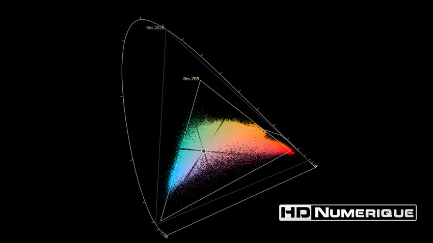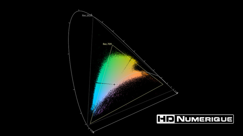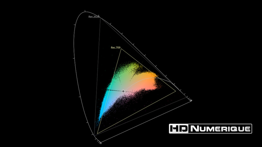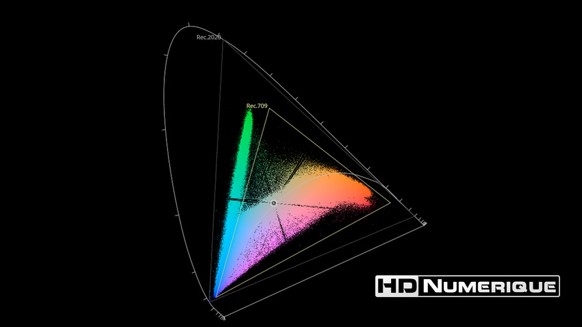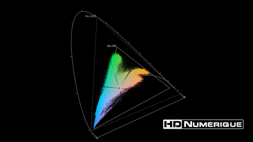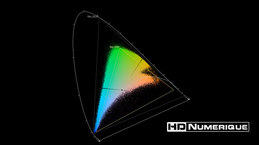 Afin de mettre en évidence l'utilisation concrète du Wide Color Gamut (WCG) sur cette édition (voir tutoriel ici), les pixels qui se situent dans la gamme standard/BT.709 (confinés à l'intérieur du petit triangle REC.709) vous sont présentés ici entièrement désaturés. A l'inverse, ceux faisant partie de la gamme élargie BT.2020, exclusive au disque 4K Ultra HD Blu-ray (qui s'étendent à l'extérieur du petit triangle REC.709) vous sont présentés en couleur :
