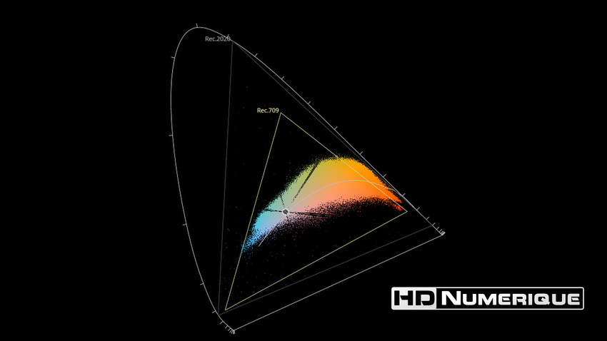 Afin de mettre en évidence l'utilisation concrète du Wide Color Gamut (WCG) sur cette édition (voir tutoriel ici), les pixels qui se situent dans la gamme standard/BT.709 (confinés à l'intérieur du petit triangle REC.709) vous sont présentés ici entièrement désaturés. A l'inverse, ceux faisant partie de la gamme élargie BT.2020, exclusive au disque 4K Ultra HD Blu-ray (qui s'étendent à l'extérieur du petit triangle REC.709) vous sont présentés en couleur :