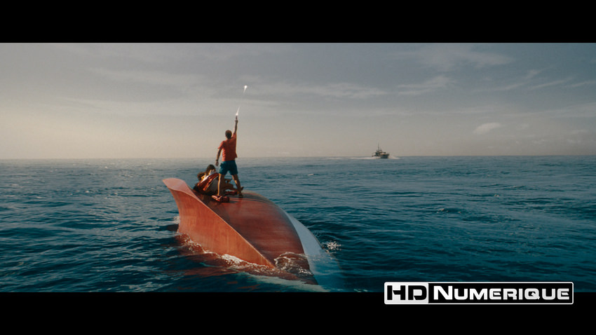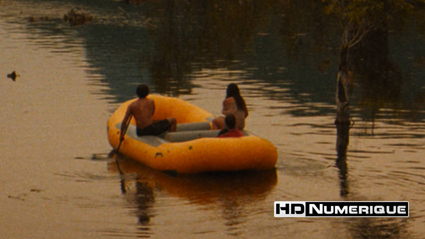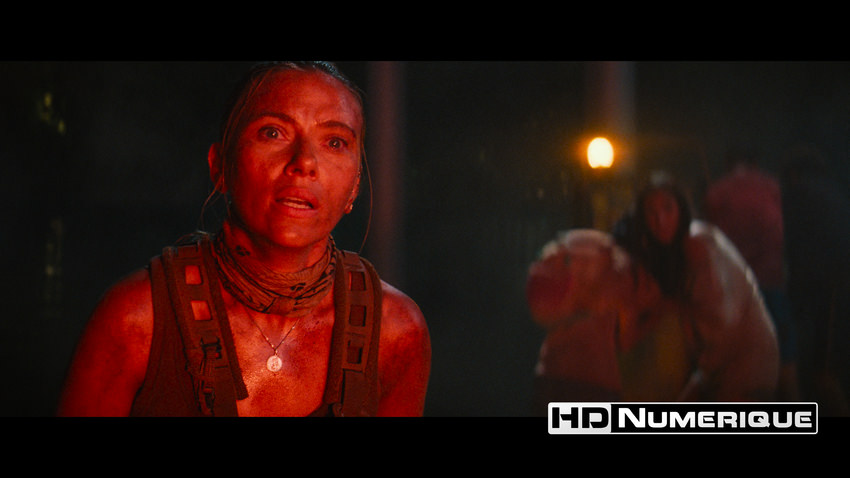 L’étalonnage s’appuie sur des LUTs d’émulation de pellicule d’impression Kodak. Les teintes chair, volontairement halées — notamment sur Rupert Friend et Scarlett Johansson — s’affirment rapidement. Dans les environnements tropicaux, la température de couleur demeure chaude, malgré la présence de verts et de bleus particulièrement vifs. On observe également une belle séparation entre la flore baignée de soleil et les zones d’ombre denses, où le grain 35 mm gagne en présence.