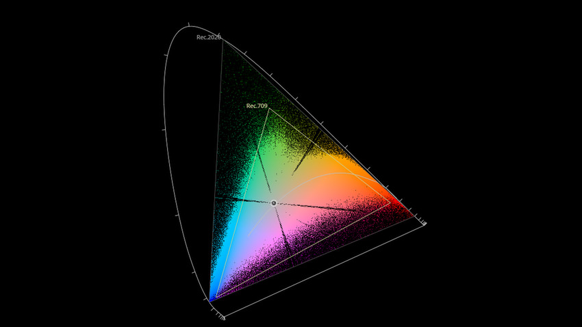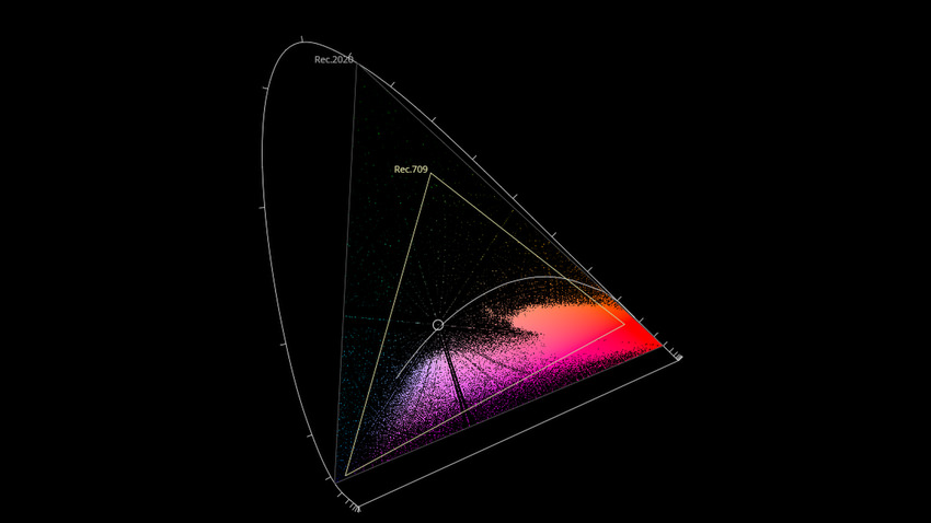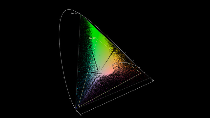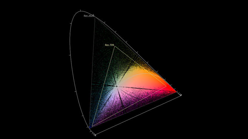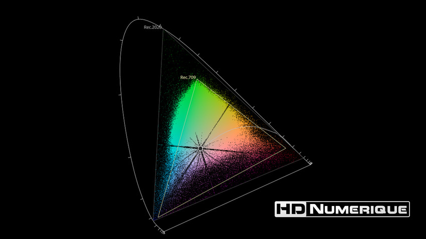 Afin de mettre en évidence l'utilisation concrète du Wide Color Gamut (WCG) sur cette édition (voir tutoriel ici), les pixels qui se situent dans la gamme standard/BT.709 (confinés à l'intérieur du petit triangle REC.709) vous sont présentés ici entièrement désaturés. A l'inverse, ceux faisant partie de la gamme élargie BT.2020, exclusive au disque 4K Ultra HD Blu-ray (qui s'étendent à l'extérieur du petit triangle REC.709) vous sont présentés en couleur :