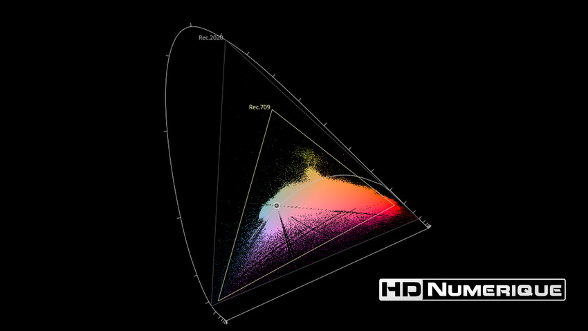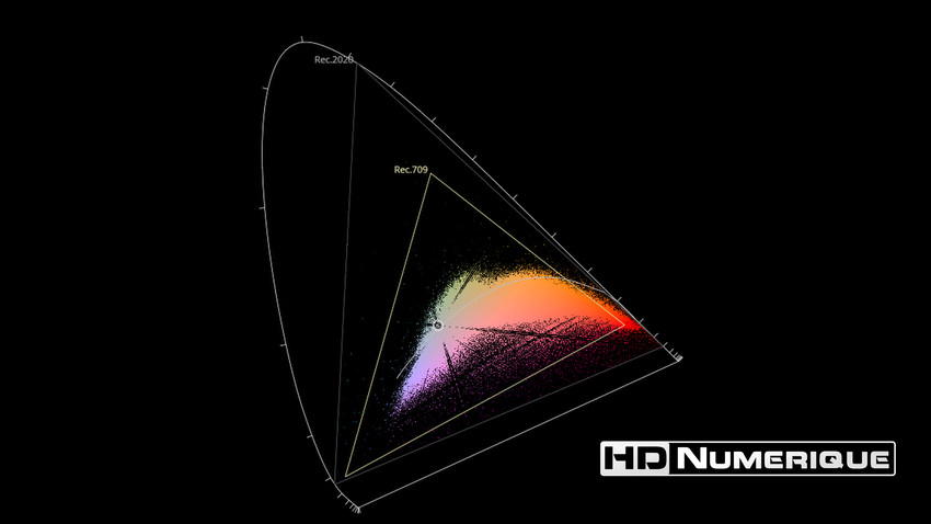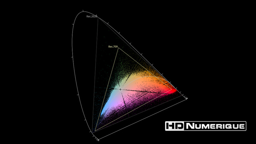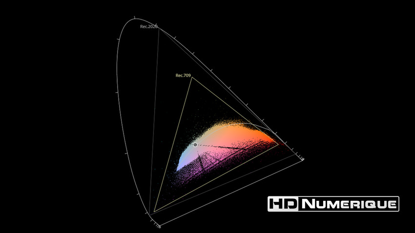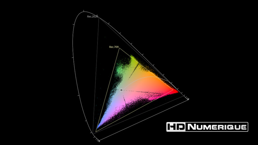 Afin de mettre en évidence l'utilisation concrète du Wide Color Gamut (WCG) sur cette édition (voir tutoriel ici), les pixels qui se situent dans la gamme standard/BT.709 (confinés à l'intérieur du petit triangle REC.709) vous sont présentés ici entièrement désaturés. A l'inverse, ceux faisant partie de la gamme élargie BT.2020, exclusive au disque 4K Ultra HD Blu-ray (qui s'étendent à l'extérieur du petit triangle REC.709) vous sont présentés en couleur :