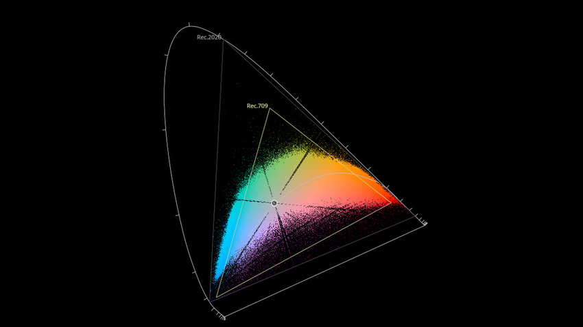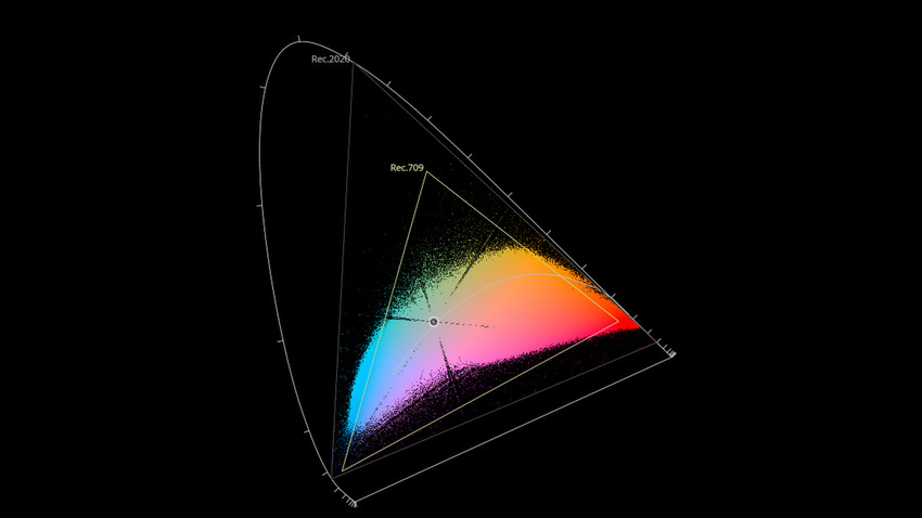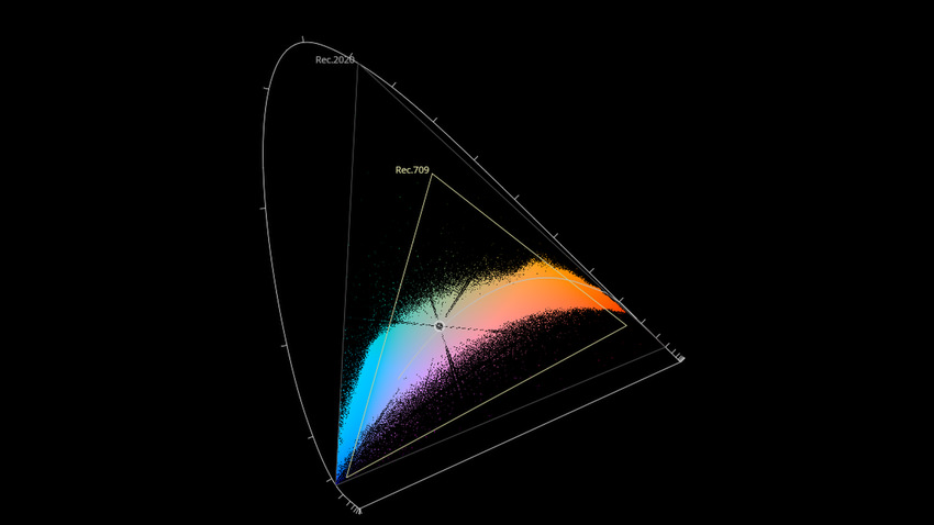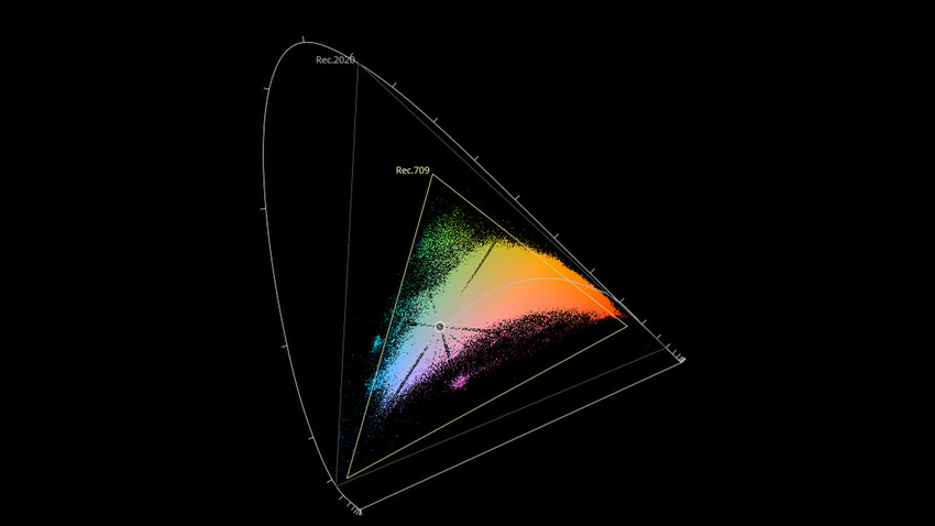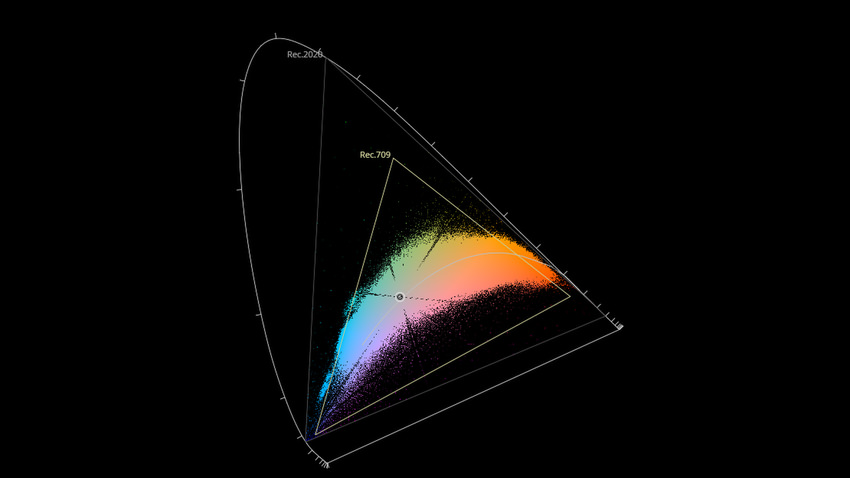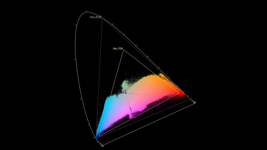 Afin de mettre en évidence l'utilisation concrète du Wide Color Gamut (WCG) sur cette édition (voir tutoriel ici), les pixels qui se situent dans la gamme standard/BT.709 (confinés à l'intérieur du petit triangle REC.709) vous sont présentés ici entièrement désaturés. A l'inverse, ceux faisant partie de la gamme élargie BT.2020, exclusive au disque 4K Ultra HD Blu-ray (qui s'étendent à l'extérieur du petit triangle REC.709) vous sont présentés en couleur :