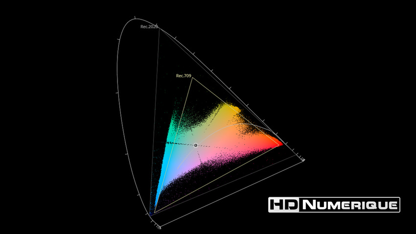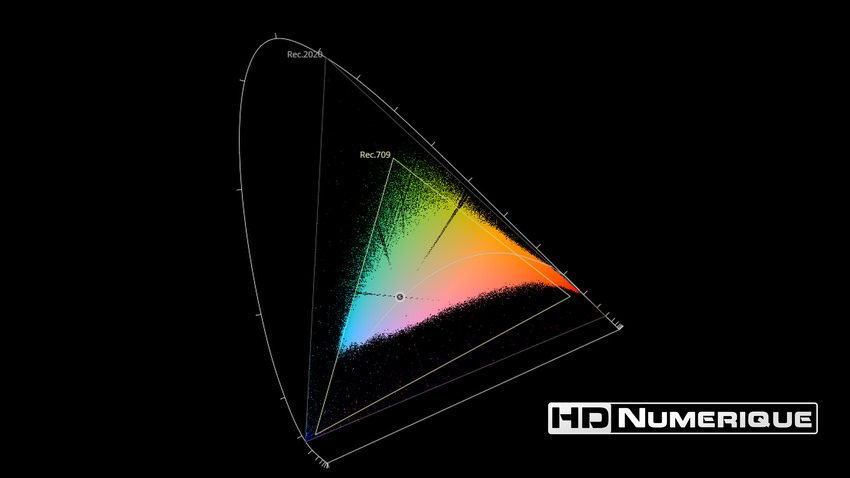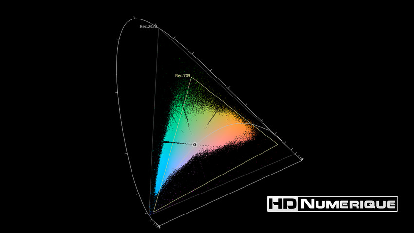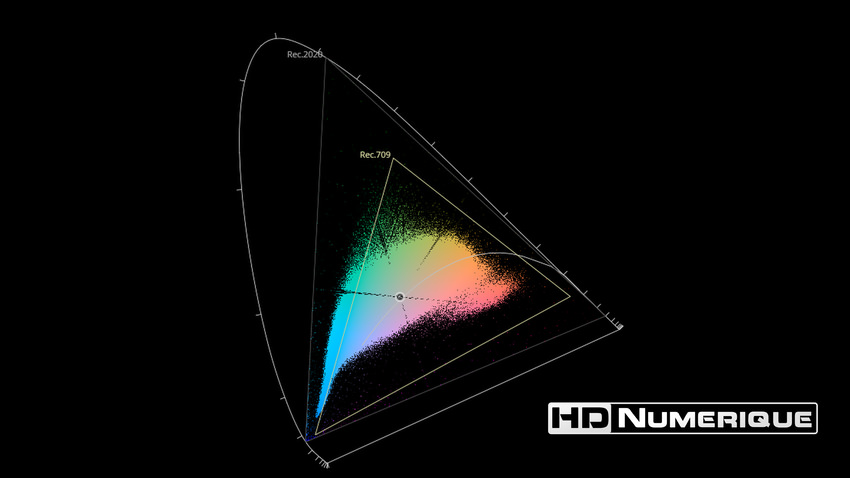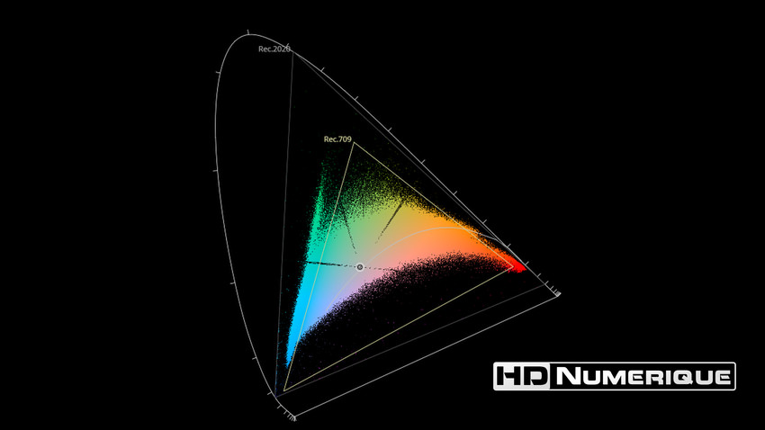 Afin de mettre en évidence l'utilisation concrète du Wide Color Gamut (WCG) sur cette édition (voir tutoriel ici), les pixels qui se situent dans la gamme standard/BT.709 (confinés à l'intérieur du petit triangle REC.709) vous sont présentés ici entièrement désaturés. A l'inverse, ceux faisant partie de la gamme élargie BT.2020, exclusive au disque 4K Ultra HD Blu-ray (qui s'étendent à l'extérieur du petit triangle REC.709) vous sont présentés en couleur :