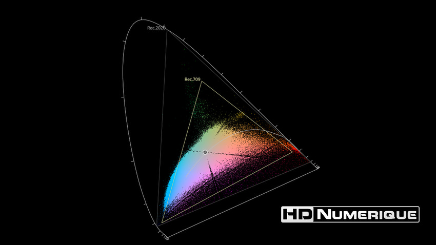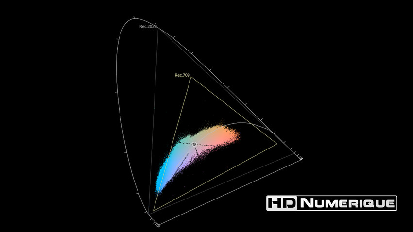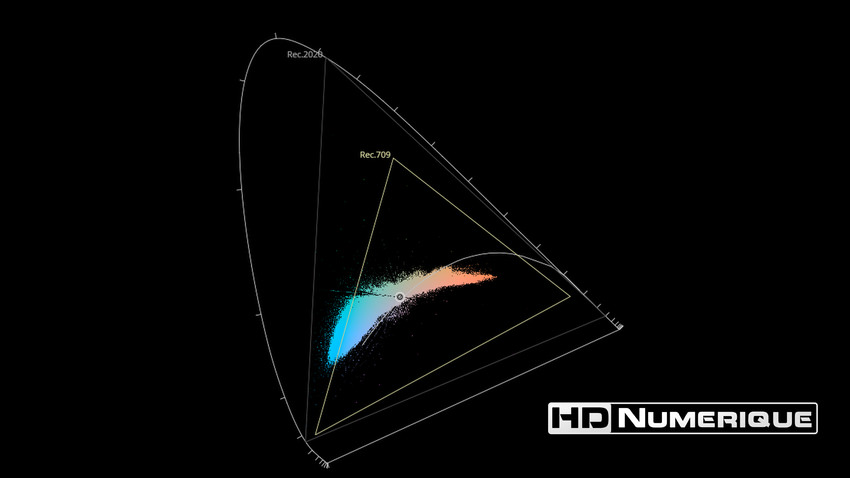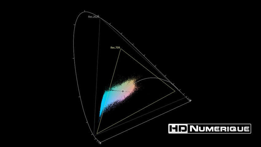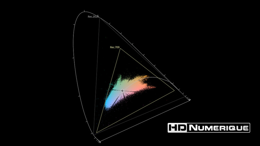 Afin de mettre en évidence l'utilisation concrète du Wide Color Gamut (WCG) sur cette édition (voir tutoriel ici), les pixels qui se situent dans la gamme standard/BT.709 (confinés à l'intérieur du petit triangle REC.709) vous sont présentés ici entièrement désaturés. A l'inverse, ceux faisant partie de la gamme élargie BT.2020, exclusive au disque 4K Ultra HD Blu-ray (qui s'étendent à l'extérieur du petit triangle REC.709) vous sont présentés en couleur :