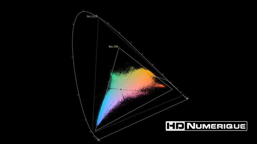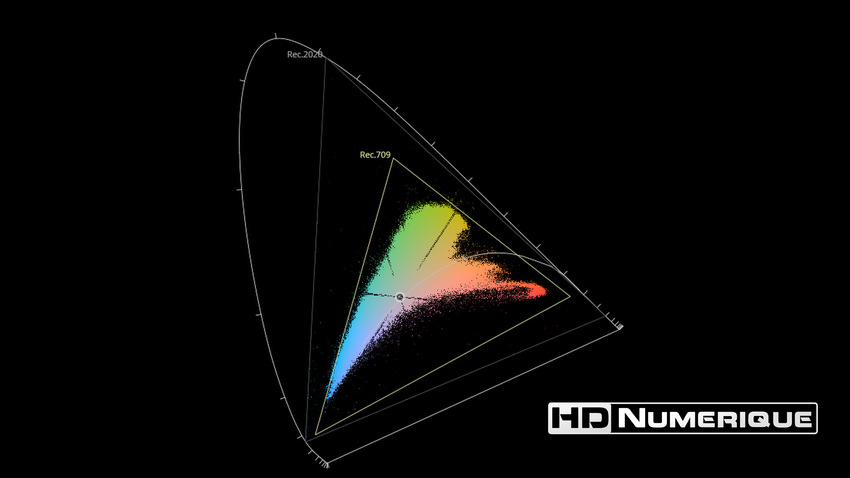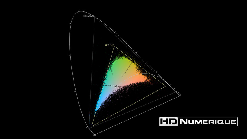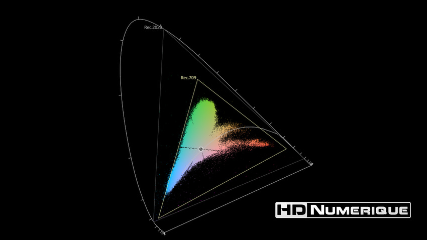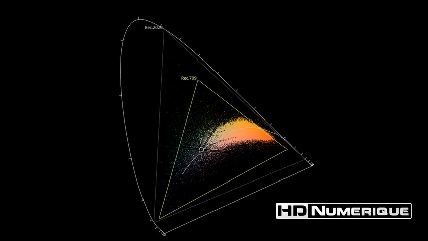 Afin de mettre en évidence l'utilisation concrète du Wide Color Gamut (WCG) sur cette édition (voir tutoriel ici), les pixels qui se situent dans la gamme standard/BT.709 (confinés à l'intérieur du petit triangle REC.709) vous sont présentés ici entièrement désaturés. A l'inverse, ceux faisant partie de la gamme élargie BT.2020, exclusive au disque 4K Ultra HD Blu-ray (qui s'étendent à l'extérieur du petit triangle REC.709) vous sont présentés en couleur :