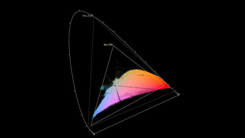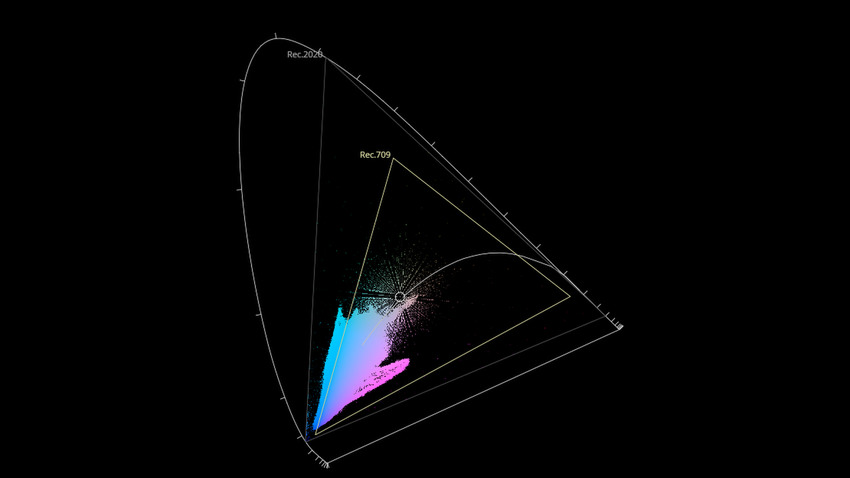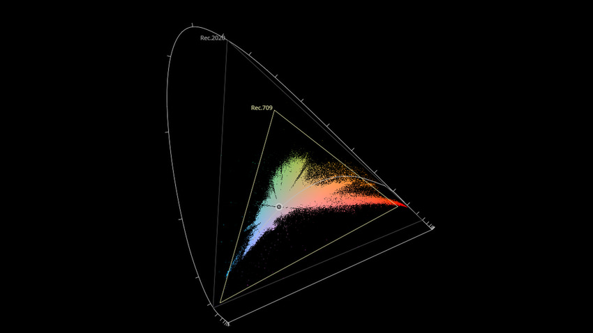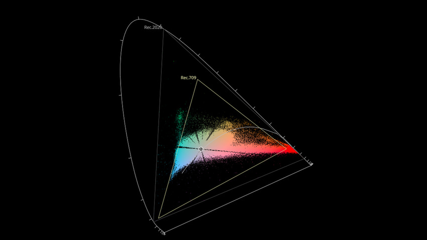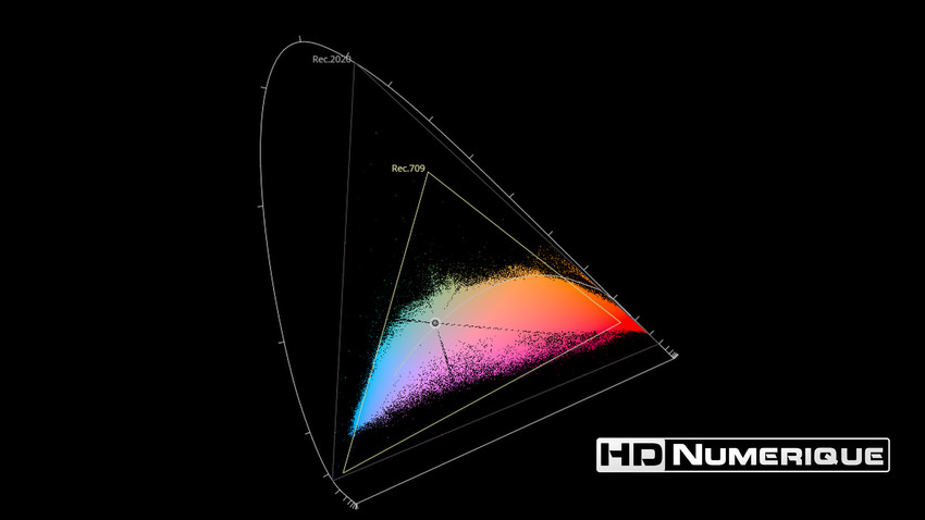 Afin de mettre en évidence l'utilisation concrète du Wide Color Gamut (WCG) sur cette édition (voir tutoriel ici), les pixels qui se situent dans la gamme standard/BT.709 (confinés à l'intérieur du petit triangle REC.709) vous sont présentés ici entièrement désaturés. A l'inverse, ceux faisant partie de la gamme élargie BT.2020, exclusive au disque 4K Ultra HD Blu-ray (qui s'étendent à l'extérieur du petit triangle REC.709) vous sont présentés en couleur :