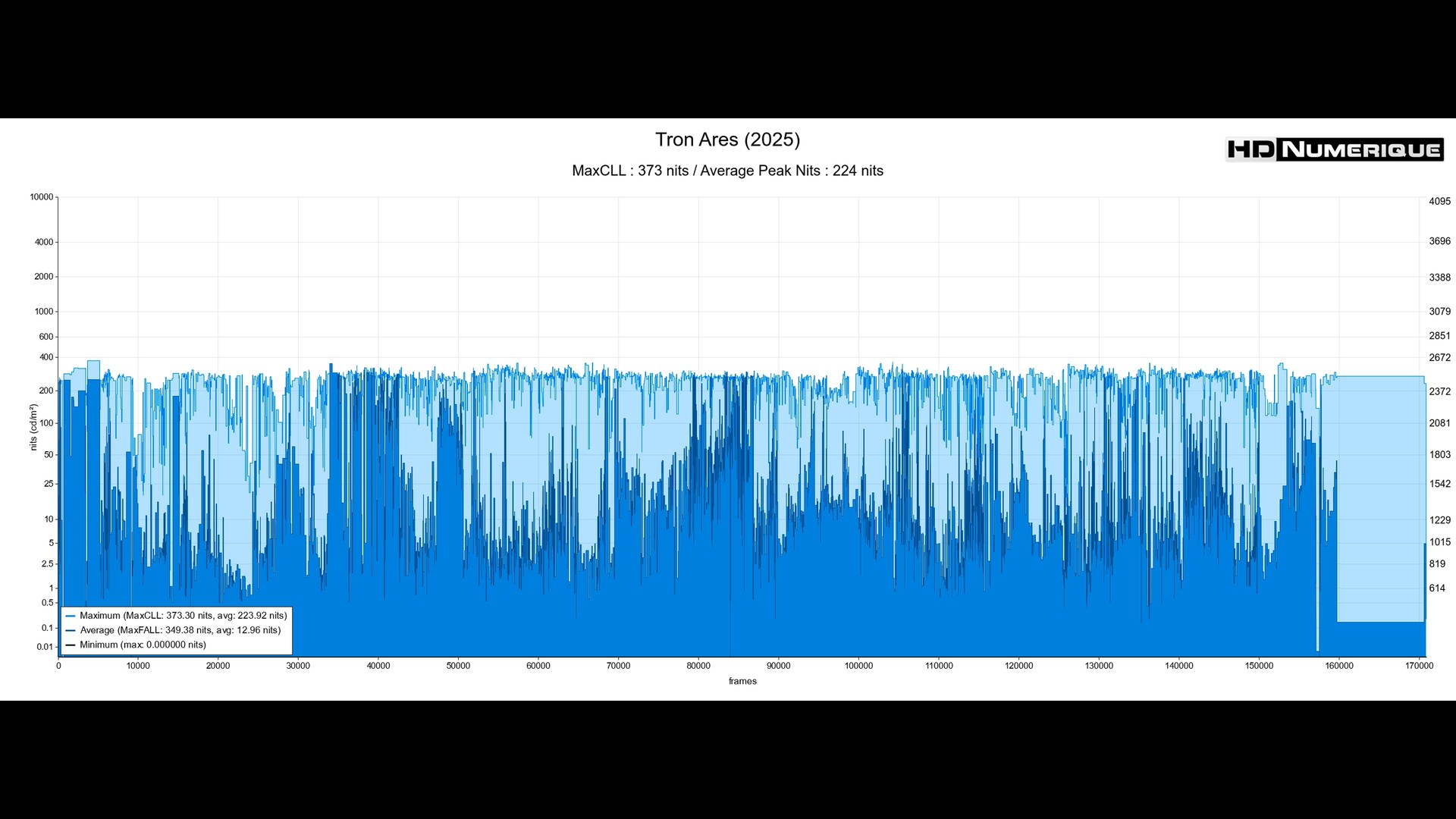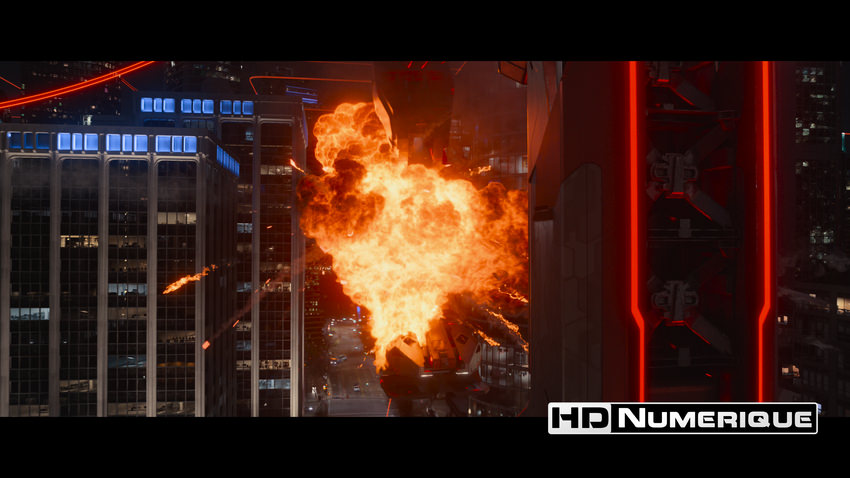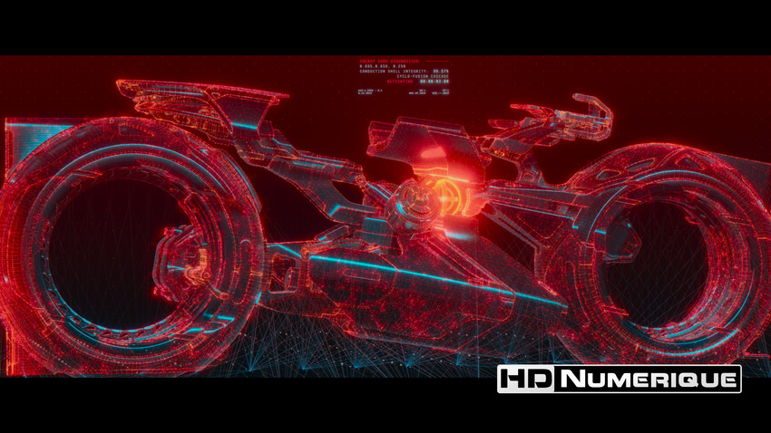 L'étalonnage HDR marque, quant à lui, une rupture chromatique radicale. Fini l'hégémonie des bleus cyans de Tron l'Héritage ; place à l'ère de Dillinger Systems et à ses teintes rouges infernales. L'étalonnage HDR embrasse cette dominante écarlate avec une ferveur rare, exploitant les tréfonds du Wide Color Gamut (ici en BT.2020). Par contre, la lecture des données chiffrées suggère une vraie retenue dans les intensités lumineuses déployées — avec des pics lumineux dont la moyenne ne dépasse pas 224 nits et un MaxCLL modéré. Ceci dit, le ressenti à l'écran relativise cette timidité. Le contraste perçu reste saisissant : chaque source de lumière, qu'il s'agisse des liserés des combinaisons, des néons, des lasers ou des traînées des Lumicycles, jaillit de l'obscurité avec une intensité qui reste électrique. Ce dynamisme offre un détachement des plans bien supérieur à la version SDR. En témoigneront les nombreux shows de laser rouges qui vous apparaîtront sculptés avec une sophistication plus affirmée.