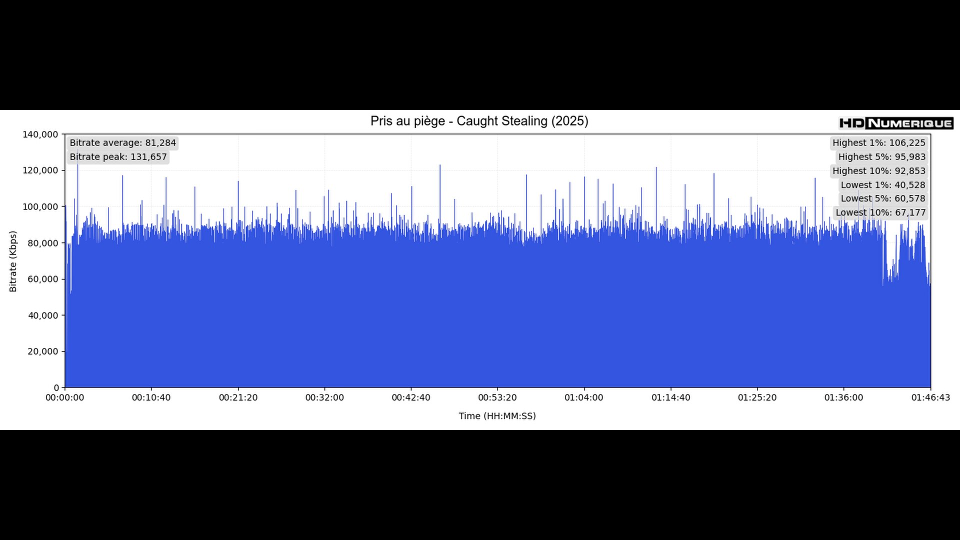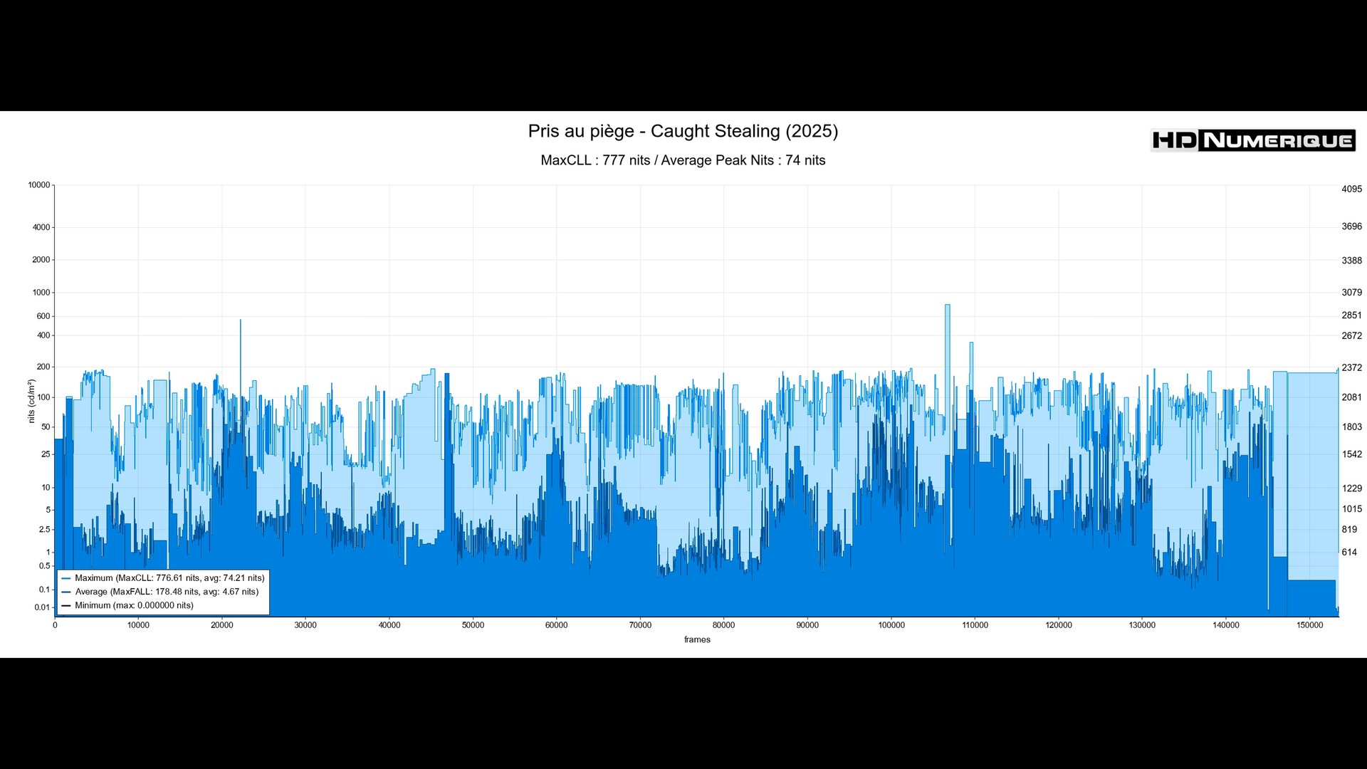 Le verdict technique se corse sur le terrain de l'étalonnage HDR. Soyez prévenus : Pris au Piège (2025) est une œuvre sombre, "claustrophobe", qui refuse le spectacle lumineux gratuit. L'étalonnage reste extrêmement conservateur, collant à l'esthétique des bars miteux et des ruelles éclairées au néon. Nos mesures révèlent une moyenne de pics lumineux particulièrement basse, plafonnant à 74 nits seulement. Dans cette approche HDR très contenue, les différences avec la version SDR se jouent ici encore dans la nuance : celle des dégradés de couleurs, le débouchage de zones d’ombres, et des sources de lumière ici et là réhaussées. À cela s’ajoute une mobilisation du Wide Color Gamut qui reste, elle aussi, très franchement anecdotique. Une présentation austère, mais qui semble absolument fidèle aux intentions des créateurs.