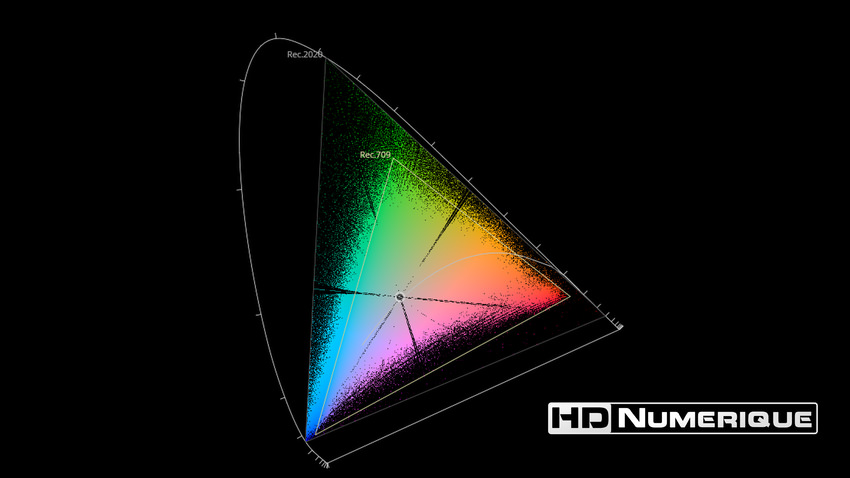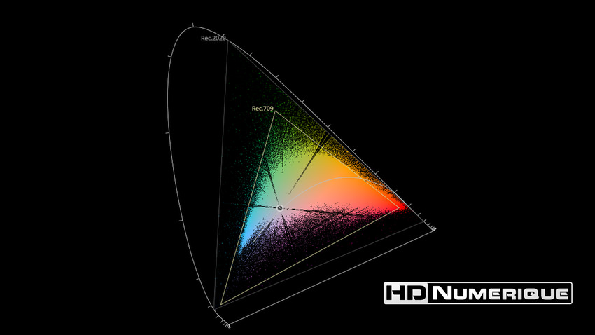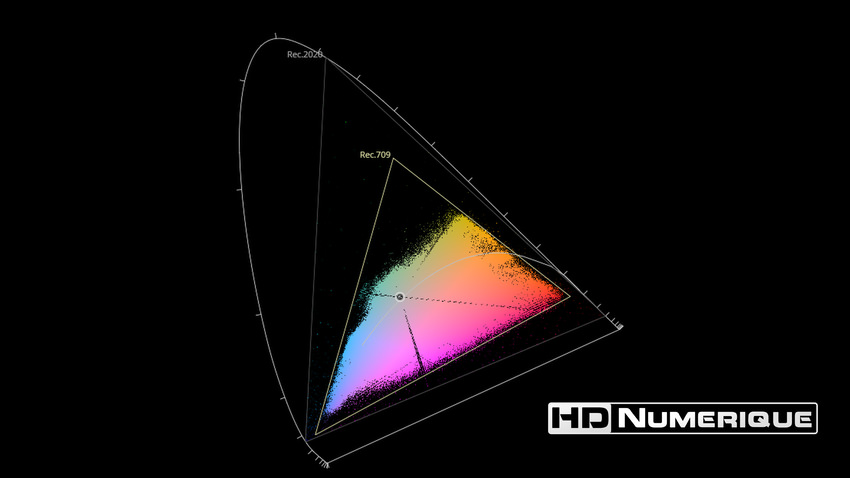 Afin de mettre en évidence l'utilisation concrète du Wide Color Gamut (WCG) sur cette édition (voir tutoriel ici), les pixels qui se situent dans la gamme standard/BT.709 (confinés à l'intérieur du petit triangle REC.709) vous sont présentés ici entièrement désaturés. A l'inverse, ceux faisant partie de la gamme élargie BT.2020, exclusive au disque 4K Ultra HD Blu-ray (qui s'étendent à l'extérieur du petit triangle REC.709) vous sont présentés en couleur :