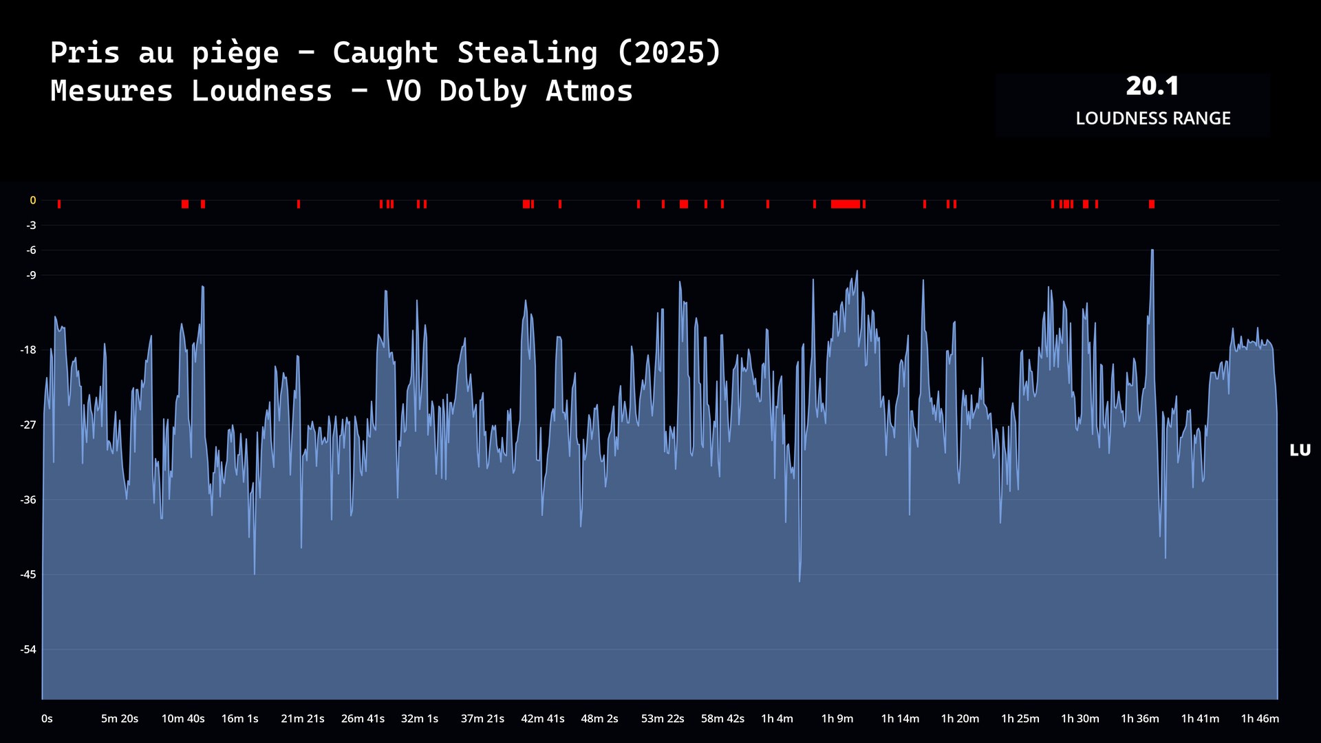 La valeur de Loudness Range a été mesurée à 20.1 LU pour la version originale Dolby Atmos, core TrueHD 7.1 (4764 kbps, sous 24-bit). La VFF est disponible en DTS-HD Master Audio 5.1 (16-bit, 1932 kbps).
