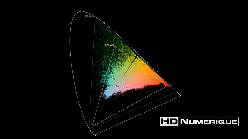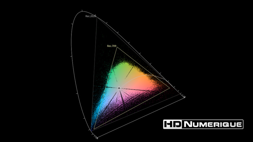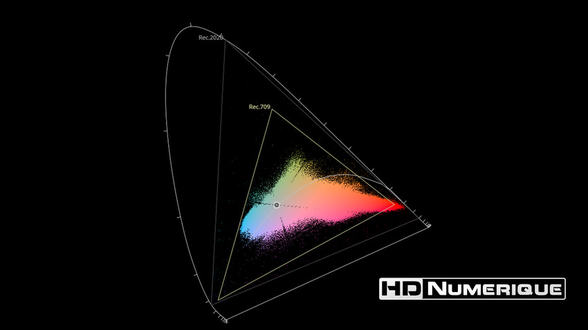 Afin de mettre en évidence l'utilisation concrète du Wide Color Gamut (WCG) sur cette édition (voir tutoriel ici), les pixels qui se situent dans la gamme standard/BT.709 (confinés à l'intérieur du petit triangle REC.709) vous sont présentés ici entièrement désaturés. A l'inverse, ceux faisant partie de la gamme élargie BT.2020, exclusive au disque 4K Ultra HD Blu-ray (qui s'étendent à l'extérieur du petit triangle REC.709) vous sont présentés en couleur :
