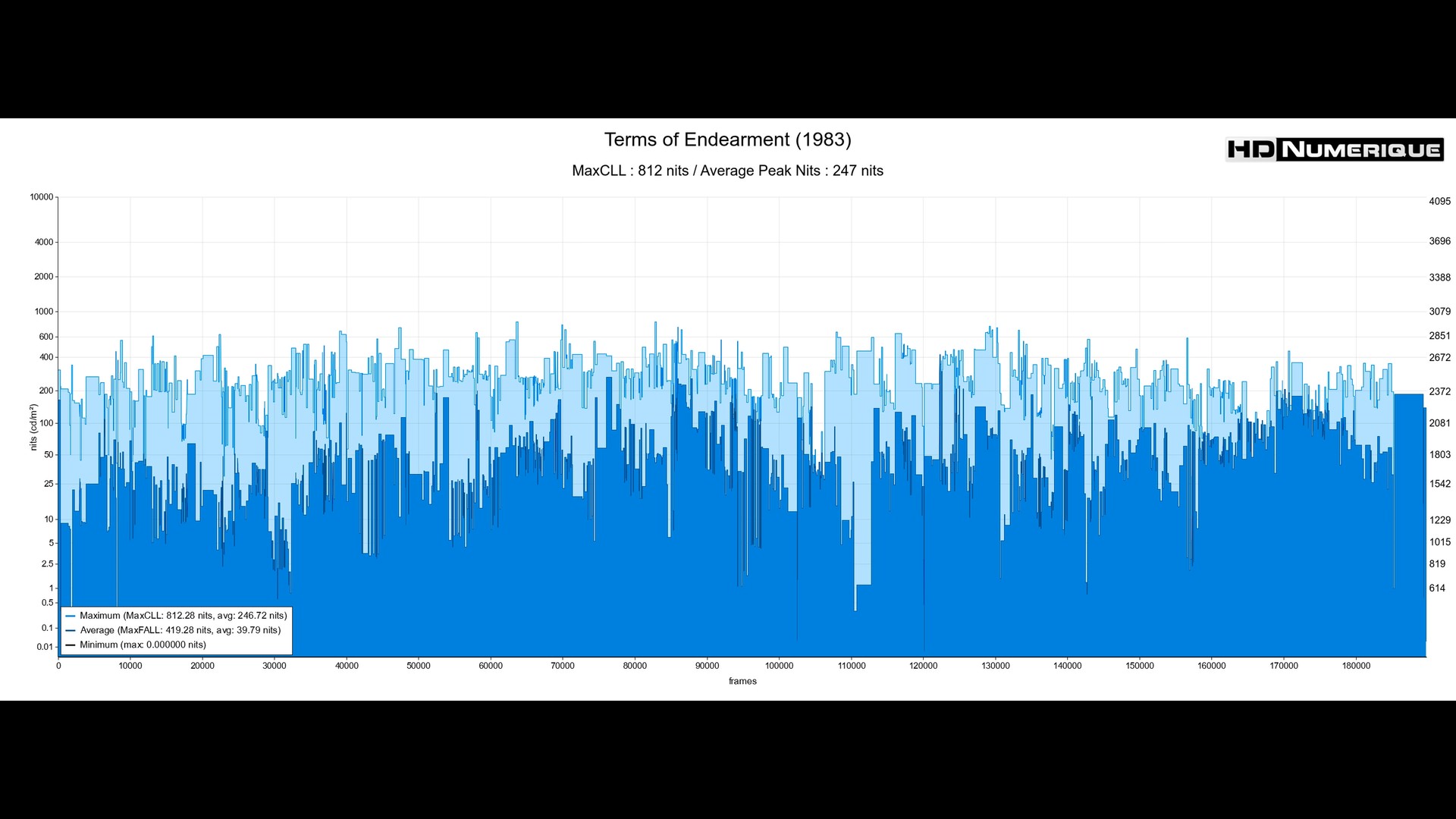 L'étalonnage HDR joue la carte de la subtilité et de la justesse. Il magnifie l'univers visuel très féminin associé au personnage d'Aurora Greenway, en sublimant les intérieurs saturés de tons chauds, les boiseries vernies et les motifs floraux de la célèbre "chambre rose". L'apport du Wide Color Gamut se fait particulièrement sentir lors des séquences en extérieur : la végétation luxuriante du jardin d'Aurora et les nuances variées des massifs de fleurs éclatent avec un naturel et une richesse inédits. Le nouvel étalonnage se démarque aussi avec une récupération précieuse de détails dans les hautes lumières. Fini les blancs brûlés : les draps, les blouses d'infirmières et les zones de ciels retrouvent de la matière. Les sources de lumière gagnent en intensité, qu'il s'agisse des fenêtres à contre-jour ou des éclairages d'appoint. Les images paraissent bien plus rigoureuses. La moyenne des pics lumineux a été mesurée à 247 nits.