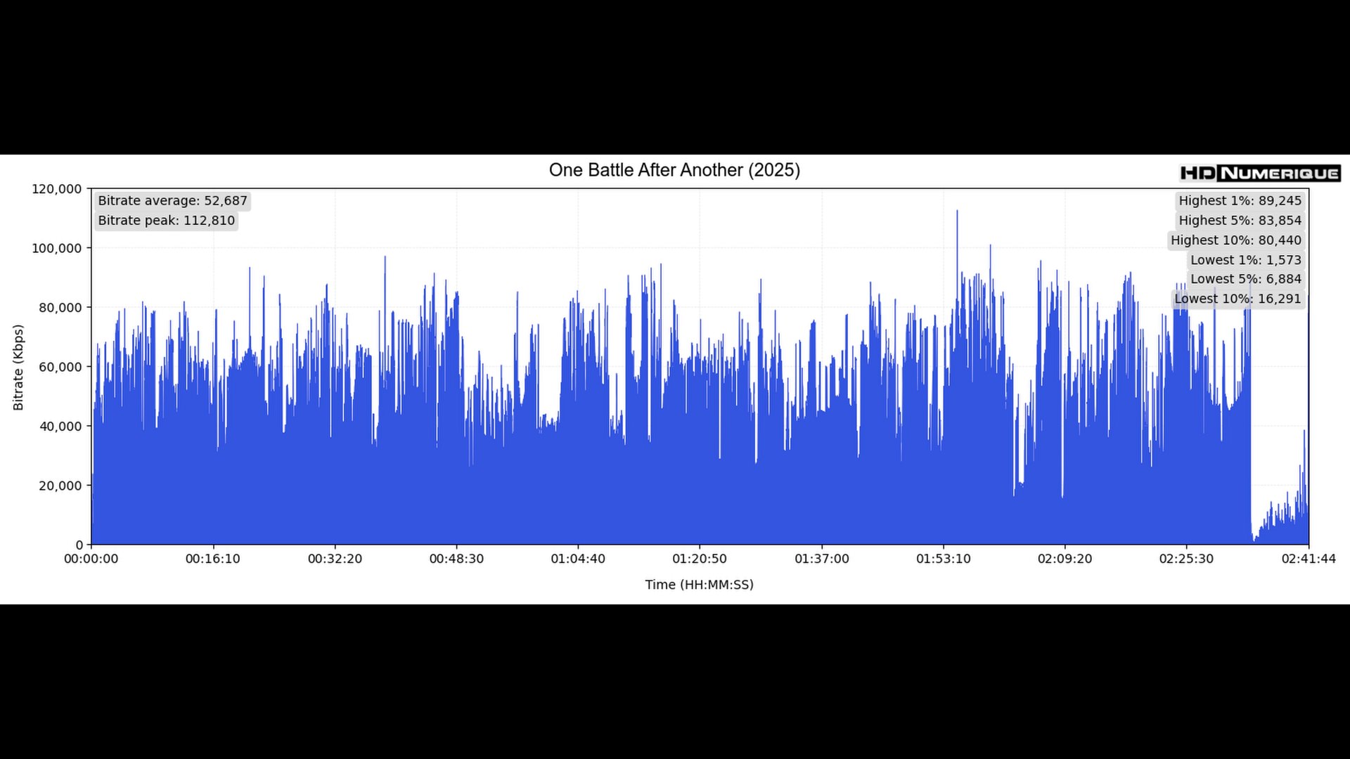 Le film impose à l'encodage un défi de taille. Qu'il s'agisse des séquences chaotiques et contrastées décrivant les activités du groupe d’activistes, ou des sections plus pastorales et paranoïaques où évoluent Pat et Willa, la compression HEVC ne faiblit pas. Malgré un bitrate moyen mesuré à 52.6 Mbps — une valeur modeste mais inévitable au regard des 161 minutes du métrage — la structure du grain, fine et organique, tient le cap avec une belle homogénéité.