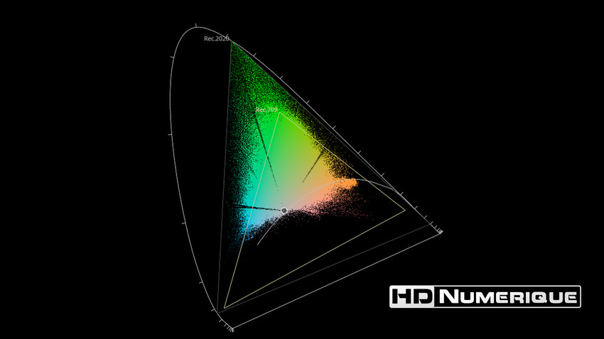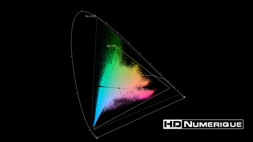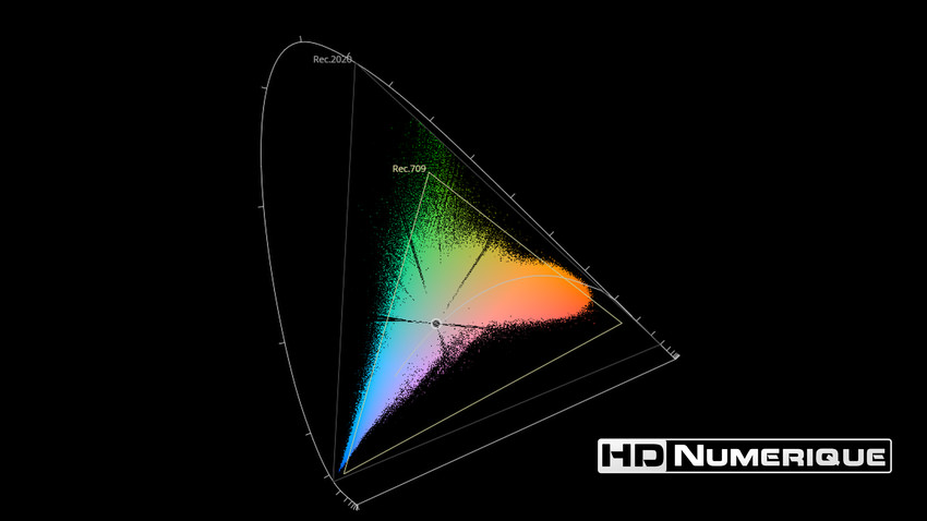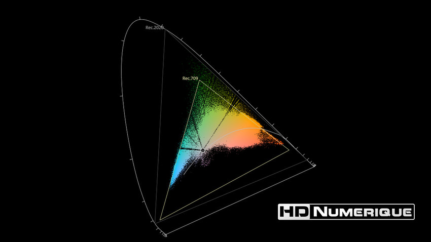 Afin de mettre en évidence l'utilisation concrète du Wide Color Gamut (WCG) sur cette édition (voir tutoriel ici), les pixels qui se situent dans la gamme standard/BT.709 (confinés à l'intérieur du petit triangle REC.709) vous sont présentés ici entièrement désaturés. A l'inverse, ceux faisant partie de la gamme élargie BT.2020, exclusive au disque 4K Ultra HD Blu-ray (qui s'étendent à l'extérieur du petit triangle REC.709) vous sont présentés en couleur :