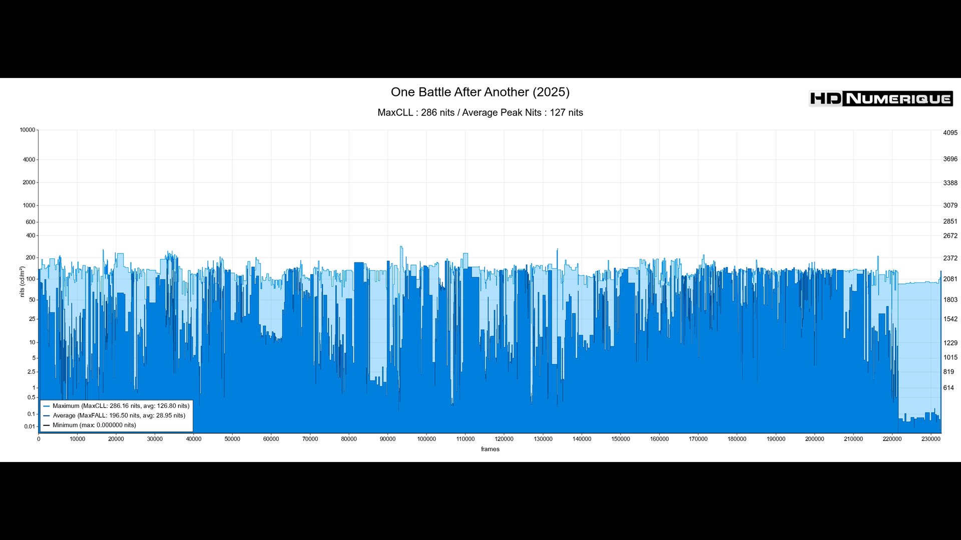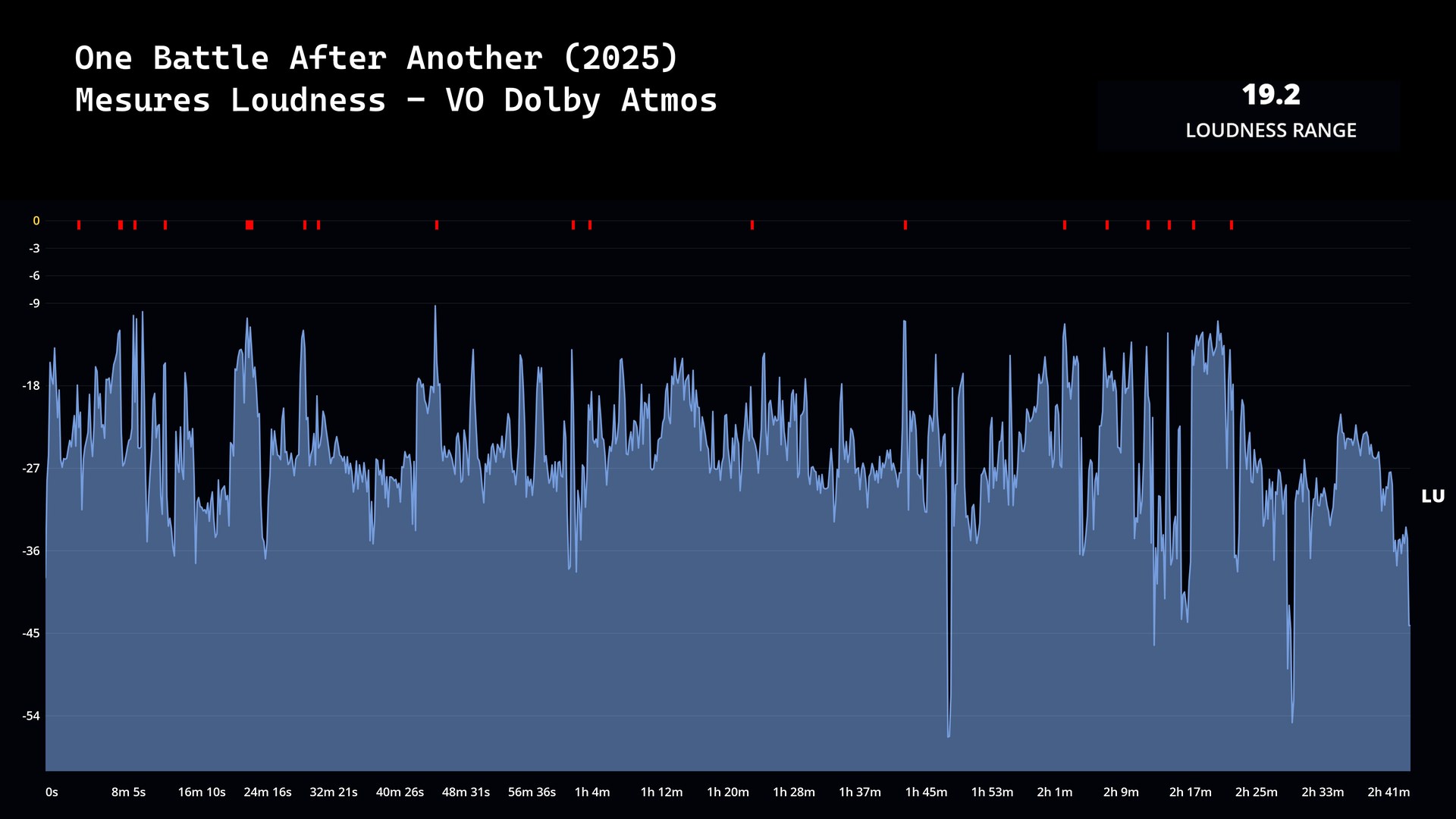 VO et VF sont restitués en Dolby Atmos (core TrueHD, 3287 et 3464 kbps, sous 16-bit). En VO, l’indicateur de Loundless Range a été mesuré à 19.2 LU.