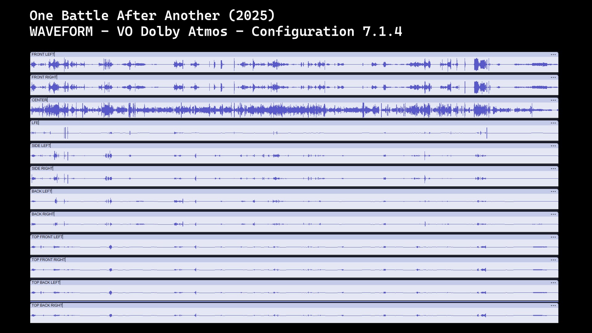 Les deux pistes audio principales, VO comme VF, sont proposées en Dolby Atmos (core TrueHD, lossless). L’analyse faite en Atmos Viewer ne révèle aucun mouvement d’objets véritablement identifiables, ce qui rapproche l’expérience d’une architecture 7.1.2 à canaux fixes. Bien qu'elle ne cherche pas à saturer l'espace en permanence, cette section Atmos déploie une activité suffisamment nerveuse pour simuler avec brio le chaos des scènes d’agitation civile et de course-poursuite automobile. Les habitués du cinéma d'Anderson reconnaîtront aussi certaines signatures et accents musicaux.