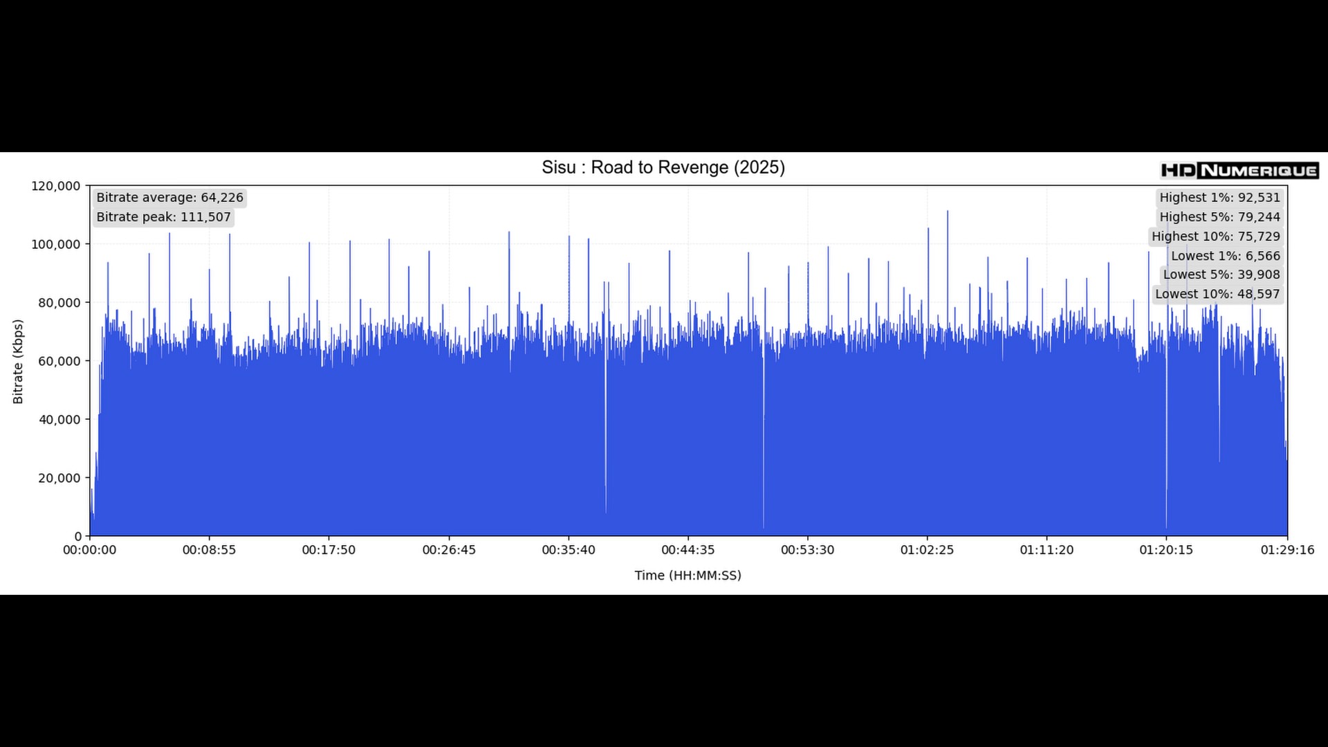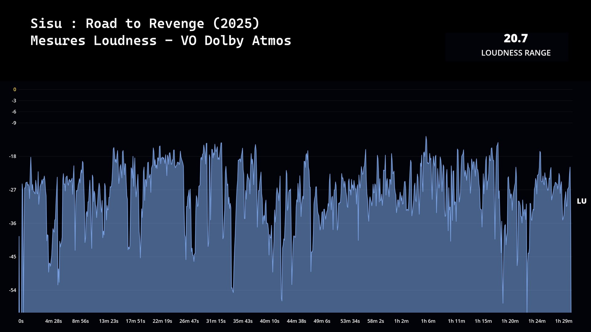 Pour la VO Atmos (core TrueHD 7.1, 24 bits, à 4426 kb/s), l’indicateur de Loudness Range a été mesuré à 20,7 LU. La VF (internationale) est restituée en DTS-HD Master Audio 5.1 (1939 kb/s, sous 16 bits).