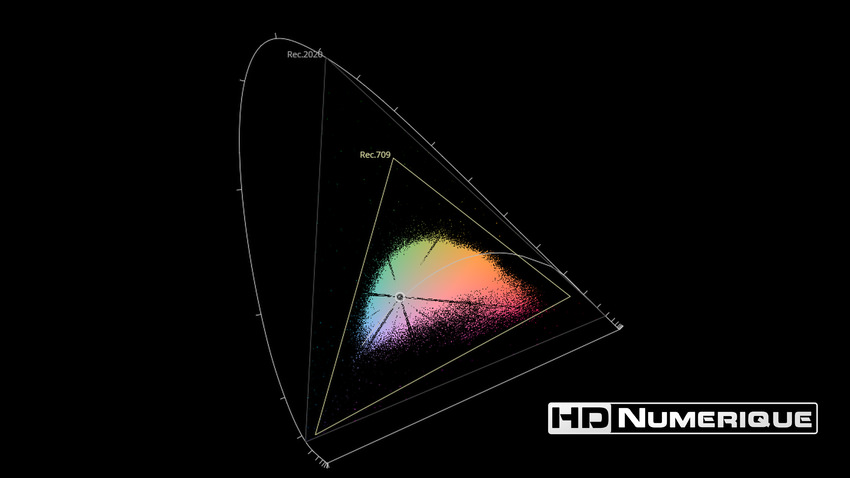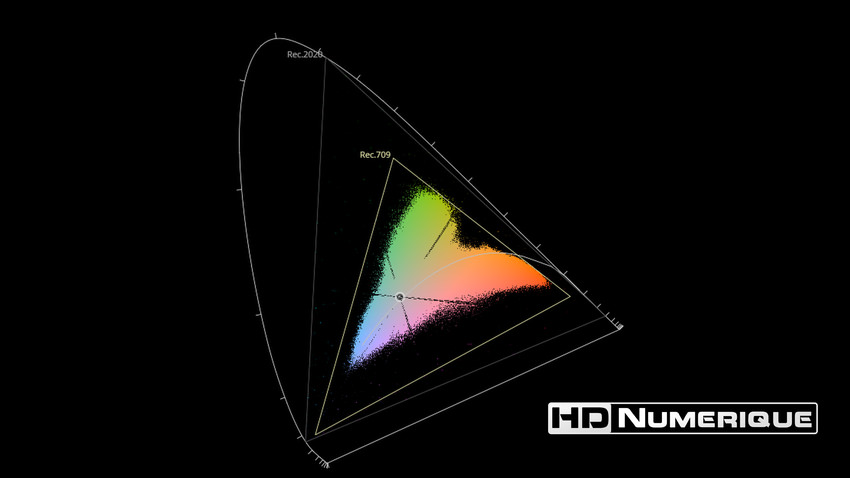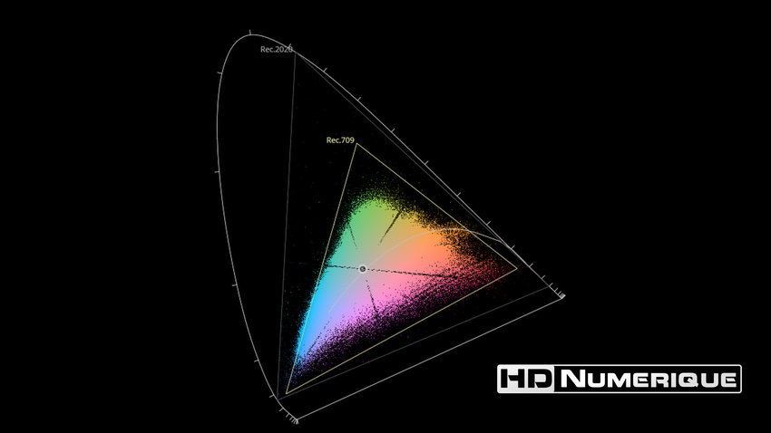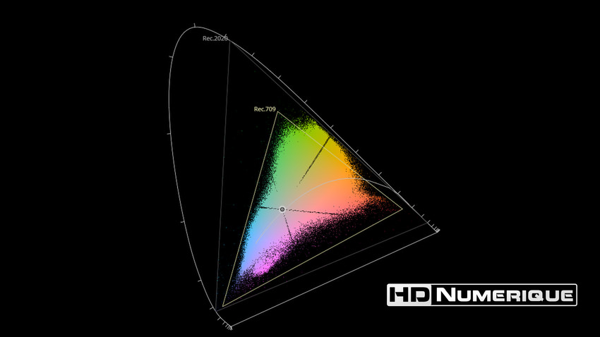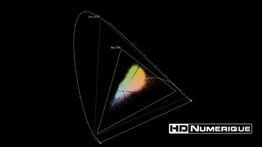 Afin de mettre en évidence l'utilisation concrète du Wide Color Gamut (WCG) sur cette édition (voir tutoriel ici), les pixels qui se situent dans la gamme standard/BT.709 (confinés à l'intérieur du petit triangle REC.709) vous sont présentés ici entièrement désaturés. A l'inverse, ceux faisant partie de la gamme élargie BT.2020, exclusive au disque 4K Ultra HD Blu-ray (qui s'étendent à l'extérieur du petit triangle REC.709) vous sont présentés en couleur :