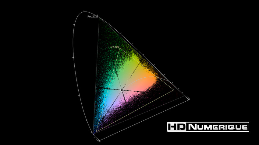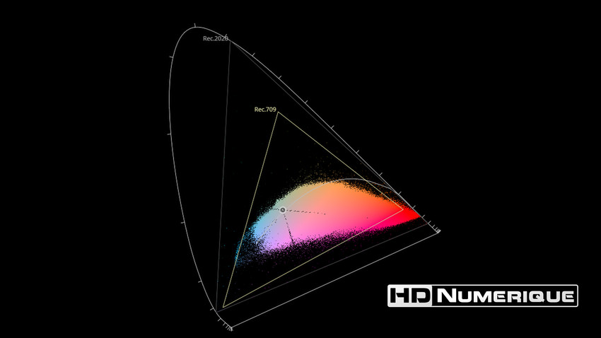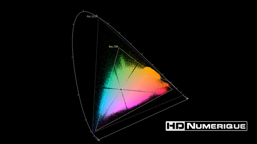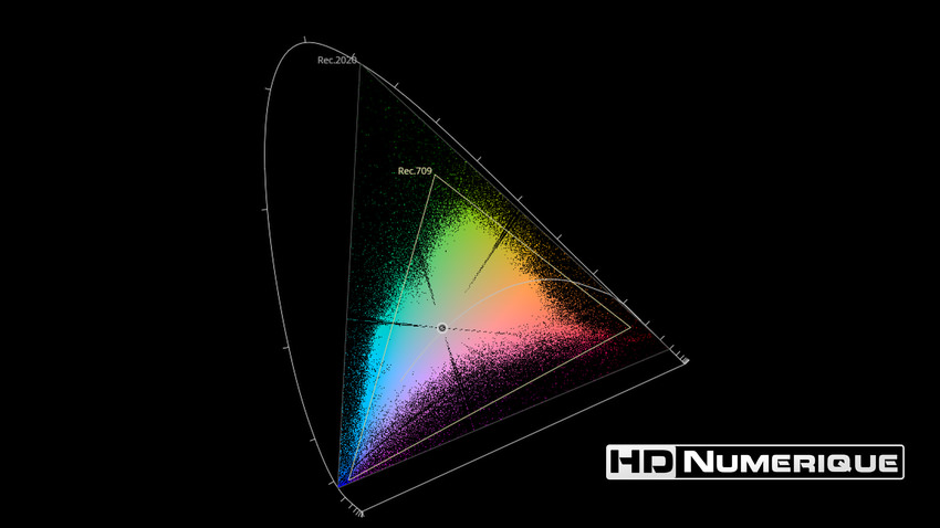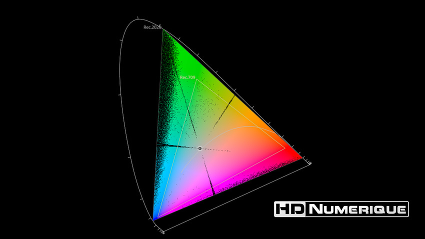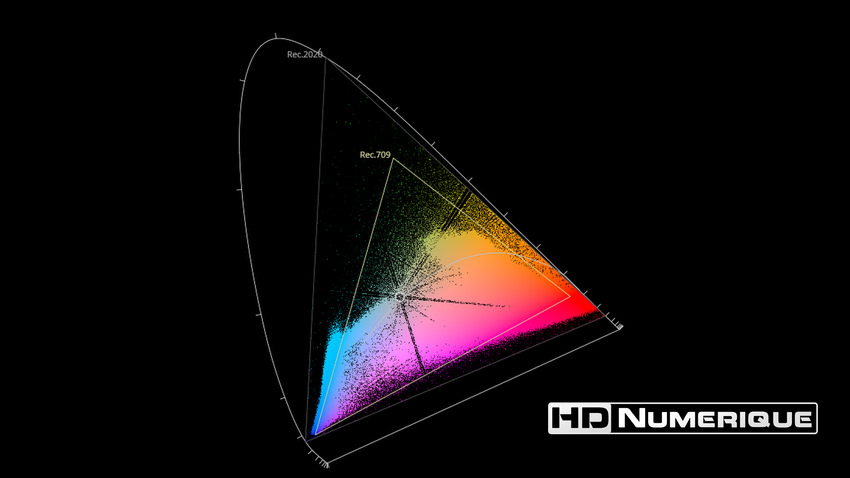 Afin de mettre en évidence l'utilisation concrète du Wide Color Gamut (WCG) sur cette édition (voir tutoriel ici), les pixels qui se situent dans la gamme standard/BT.709 (confinés à l'intérieur du petit triangle REC.709) vous sont présentés ici entièrement désaturés. A l'inverse, ceux faisant partie de la gamme élargie BT.2020, exclusive au disque 4K Ultra HD Blu-ray (qui s'étendent à l'extérieur du petit triangle REC.709) vous sont présentés en couleur :