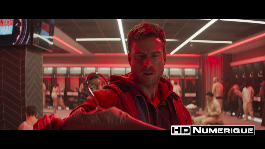L’étalonnage HDR accompagne étroitement la narration en s’appuyant sur une dualité marquée. L’introduction privilégie une esthétique froide et institutionnelle : des tonalités désaturées, dominées par des gris béton et des nuances bleutées, traduisent efficacement l’emprise du Network. L’apport du HDR permet toutefois aux éclairages néon et aux panneaux holographiques de s’exprimer avec une intensité accrue, perforant littéralement l’image. L’exploitation du Wide Color Gamut se révèle déterminante tout au long du métrage, en particulier dans la restitution de rouges particulièrement saturés et lumineux. La dynamique globale affiche une amplitude notable, notamment lors des séquences de télé-réalité, où la multiplication des sources lumineuses, des effets stroboscopiques et des interfaces du jeu télévisé exploite pleinement les capacités du format. Les pics de luminosité atteignent régulièrement des valeurs comprises entre 300 et 400 nits, pour une moyenne mesurée à 192 nits.