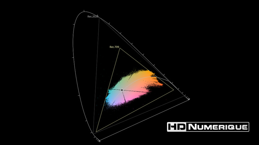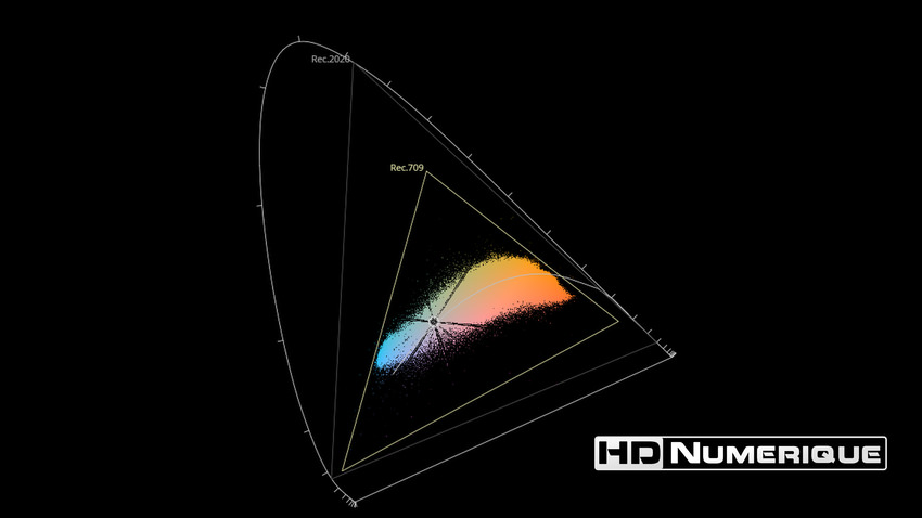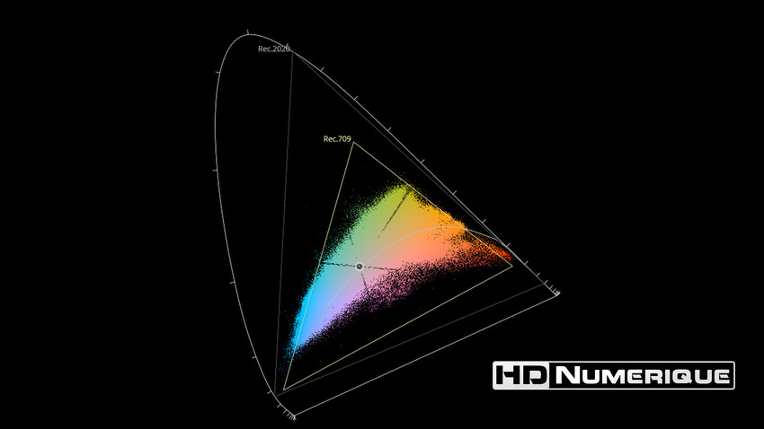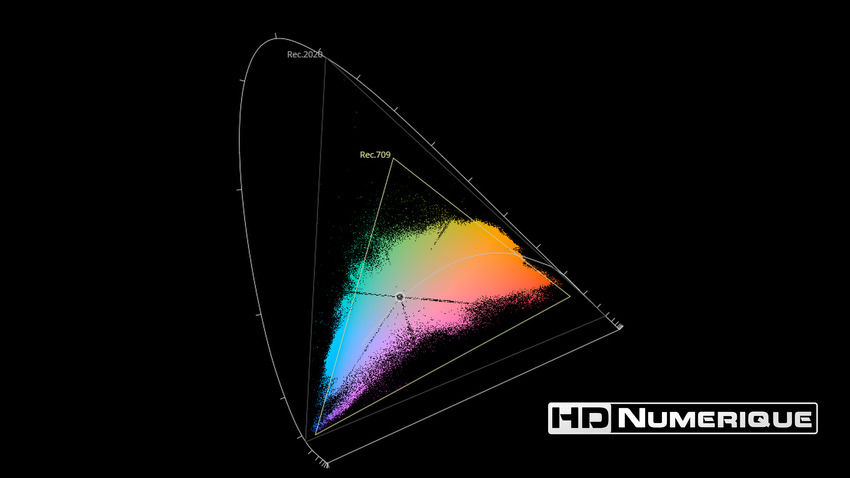 Afin de mettre en évidence l'utilisation concrète du Wide Color Gamut (WCG) sur cette édition (voir tutoriel ici), les pixels qui se situent dans la gamme standard/BT.709 (confinés à l'intérieur du petit triangle REC.709) vous sont présentés ici entièrement désaturés. A l'inverse, ceux faisant partie de la gamme élargie BT.2020, exclusive au disque 4K Ultra HD Blu-ray (qui s'étendent à l'extérieur du petit triangle REC.709) vous sont présentés en couleur :