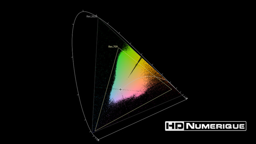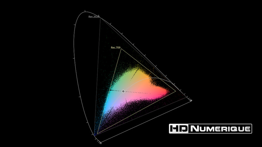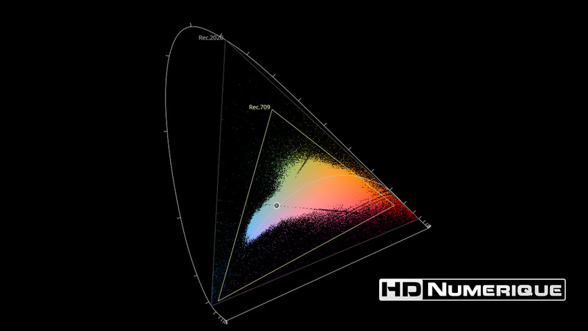 Afin de mettre en évidence l'utilisation concrète du Wide Color Gamut (WCG) sur cette édition (voir tutoriel ici), les pixels qui se situent dans la gamme standard/BT.709 (confinés à l'intérieur du petit triangle REC.709) vous sont présentés ici entièrement désaturés. A l'inverse, ceux faisant partie de la gamme élargie BT.2020, exclusive au disque 4K Ultra HD Blu-ray (qui s'étendent à l'extérieur du petit triangle REC.709) vous sont présentés en couleur :