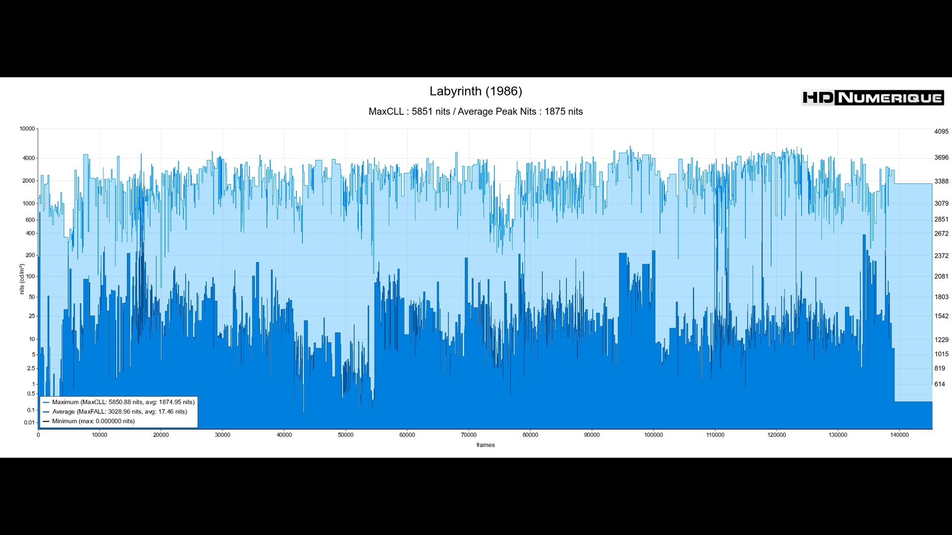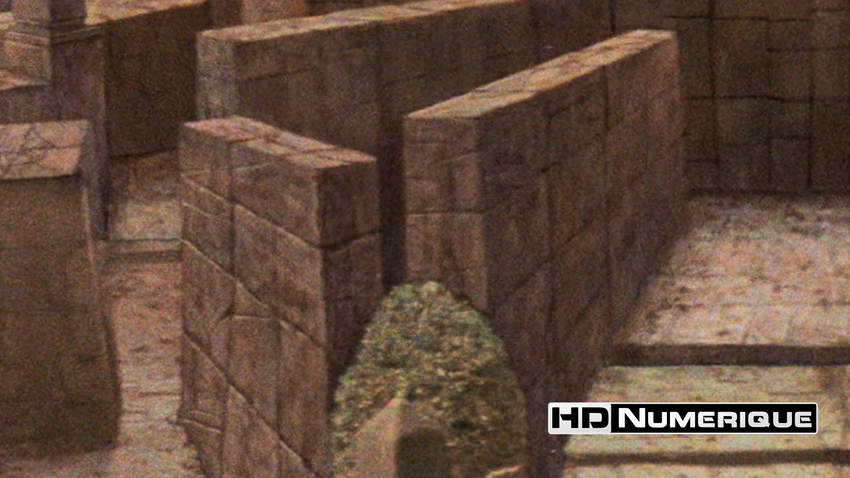 S'agissant de l'étalonnage HDR, il est très représentatif des tendances initiales de Sony Pictures lors des premiers jours de l'introduction du format UHD sur le marché. L'approche se veut musclée, avec une plage dynamique mobilisée très étendue et des valeurs d’intensité lumineuse poussées de manière sportive. Nos mesures confirment cette ardeur avec une moyenne des pics lumineux atteignant un étonnant 1875 nits. On citera volontiers l'éclat quasi surnaturel des sphères de cristal manipulées avec dextérité par Jareth : en HDR, les reflets spéculaires crèvent littéralement l'écran avec une brillance hypnotique. Ces ardeurs lumineuses se manifestent aussi avec une redoutable efficacité sur les lames rotatives des engins "Nettoyeurs" dans les tunnels étroits du labyrinthe, ou encore à travers les jeux d'éclairage complexes du numéro musical "Magic Dance". Dans un contexte où l'étape de tone-mapping reste essentielle, l'apport du Dolby Vision reste un atout bienvenu.